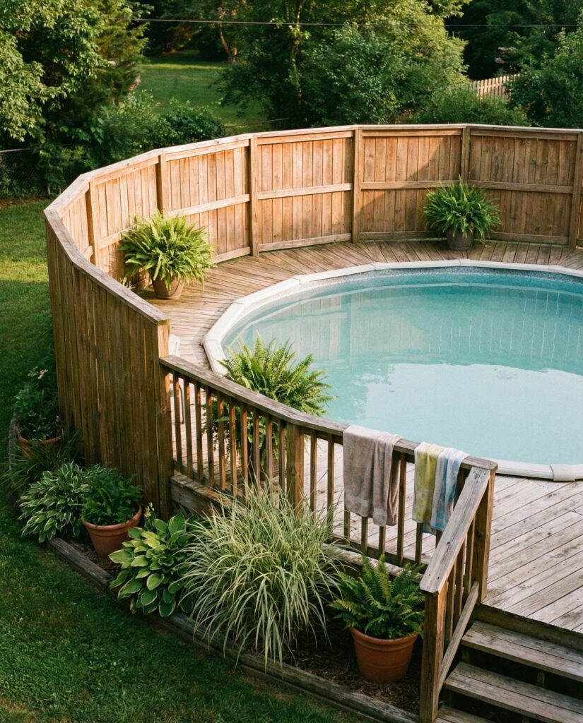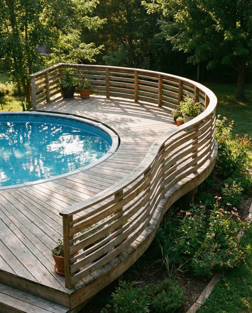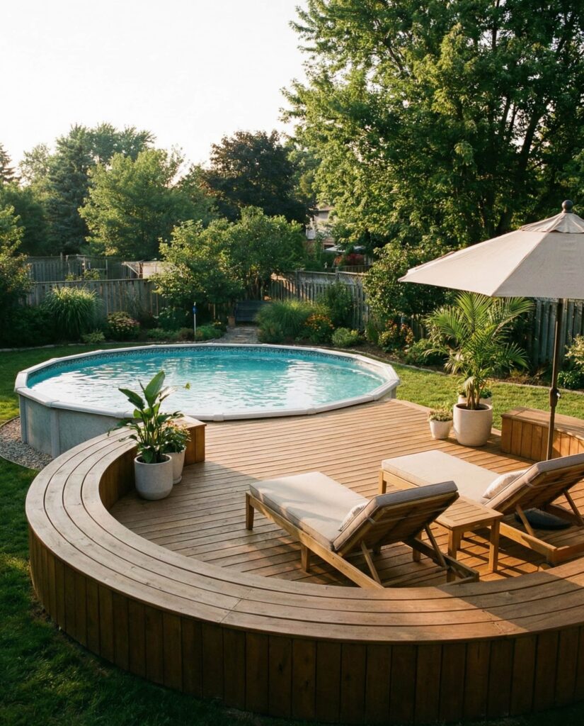 Ideas round with privacy fence combine the softness of curved decks with the comfort of enclosure. These plans often use fencing that follows the pool’s shape, maintaining visual harmony. From what I’ve observed, this setup feels especially calming in dense neighborhoods. Designers recommend spacing slats to allow airflow while blocking direct sightlines. The result is a deck that feels personal and protected without appearing closed off.