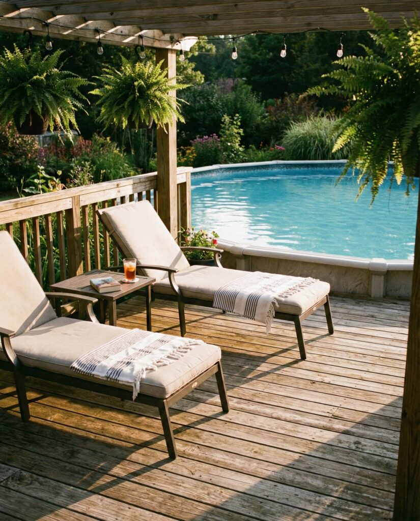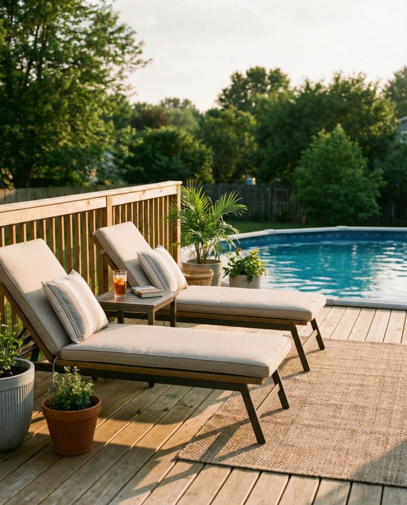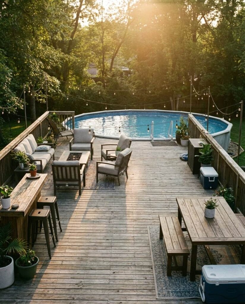 Some of the most appealing above ground pool deck ideas now emphasize rest rather than activity. These plans dedicate more space to loungers and quiet seating than to walkways or features. From personal experience, decks designed for relaxation tend to be used more consistently, not just during pool parties. Designers often suggest orienting seating to capture sun or shade depending on climate. The result is a deck that supports slow mornings and calm evenings, turning the pool area into a daily retreat rather than an occasional destination.
