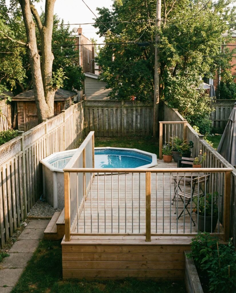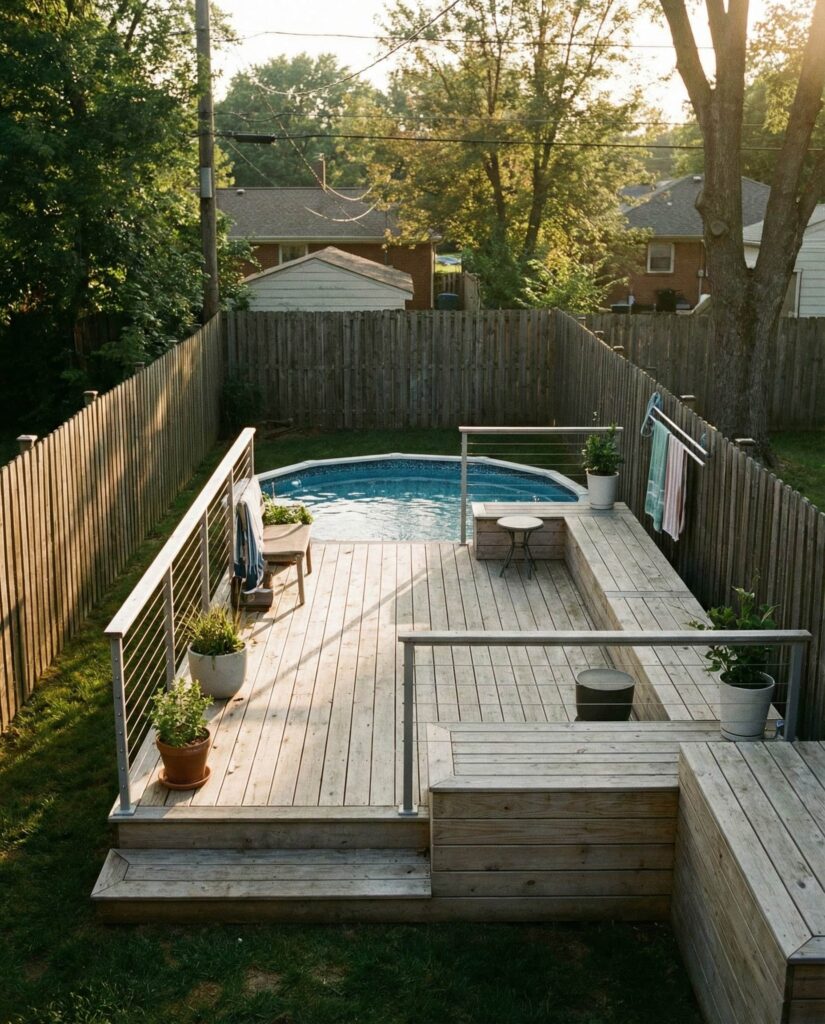 For homeowners working with limited space, compact above ground pool deck ideas focus on efficiency rather than expansion. These plans wrap closely around the pool, providing just enough room for movement and essential seating. I’ve seen narrow-yard decks succeed when designers resist overcrowding and prioritize clean circulation. Vertical railings and lighter finishes help prevent the area from feeling boxed in. This approach proves that even tight spaces can support a functional and visually appealing pool deck when proportions are carefully considered.