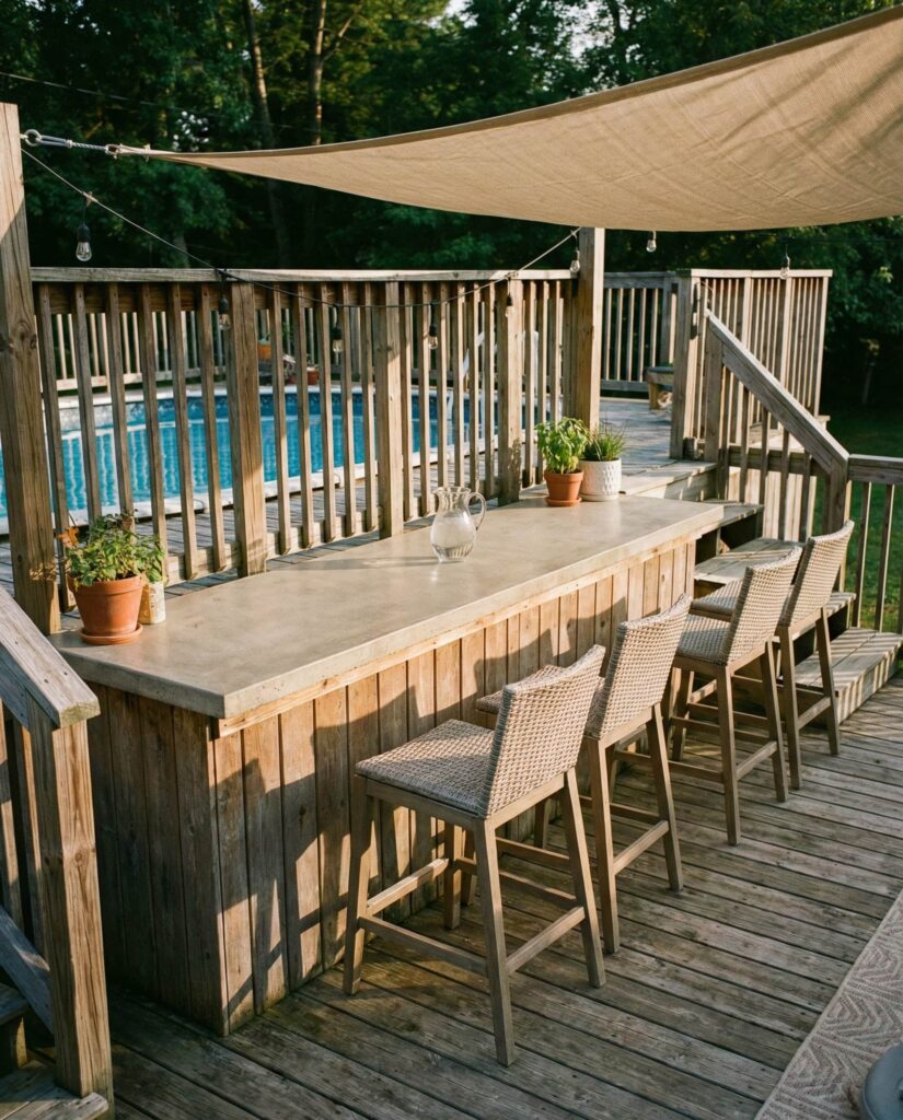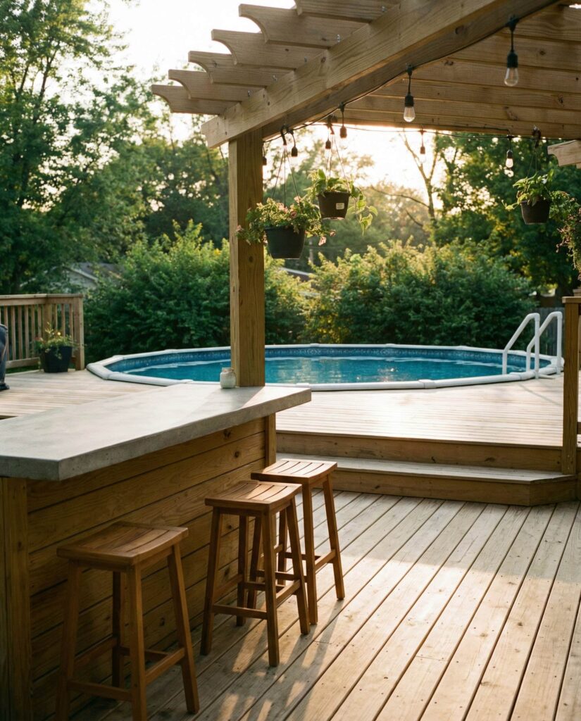Adding a bar to an above ground pool deck is one of those ideas that instantly shifts the mood from utility to hospitality. These plans usually place the bar along the outer edge of the deck, allowing swimmers to interact with guests without crowding the pool ladder. From personal observation, even a modest bar ledge becomes the most used feature during gatherings. Homeowners favor durable surfaces and shaded placement to keep drinks and snacks comfortable in summer heat. Designers often advise keeping the bar simple and integrated, so it doesn’t overpower the deck’s primary purpose.
