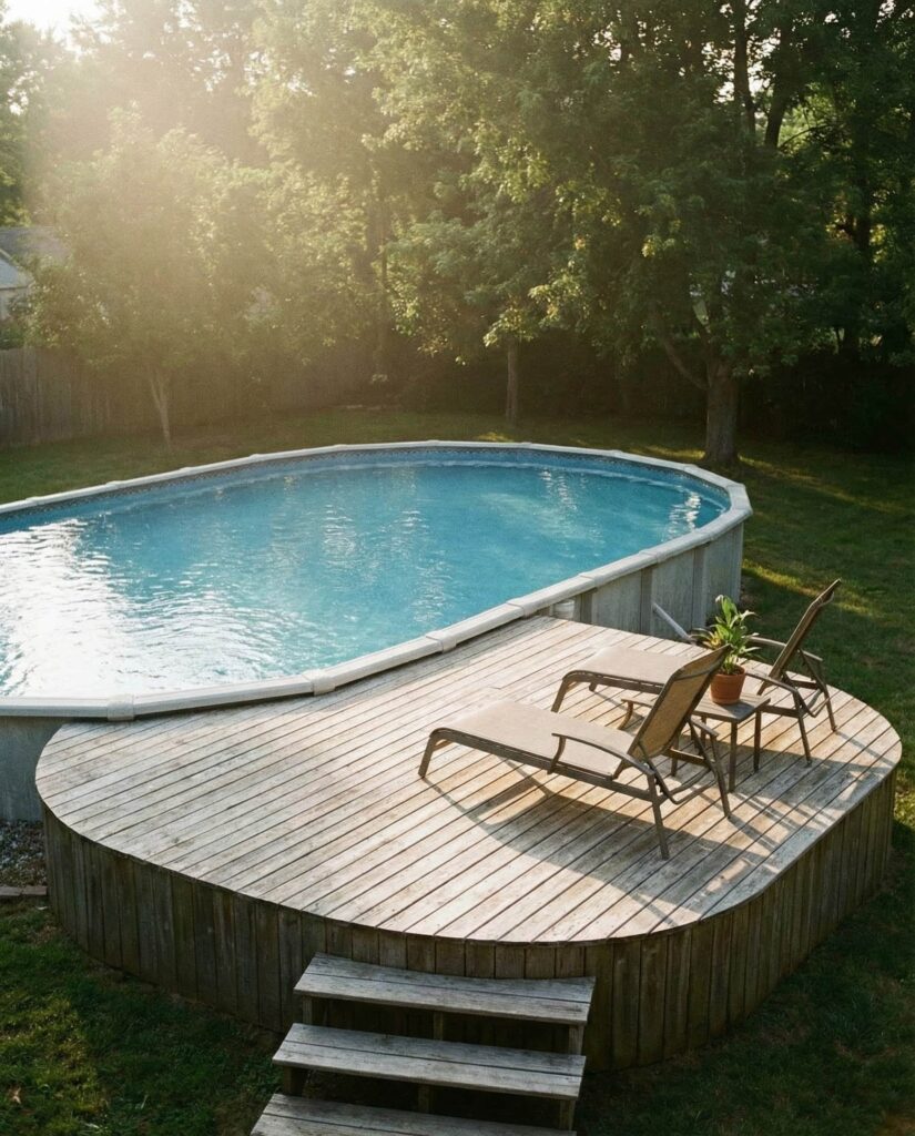 A rectangle above ground pool deck remains one of the most requested ideas because it delivers clean geometry and predictable plans that are easy to adapt. This layout works especially well for families who want space for seating, towels, and casual movement without visual clutter. Designers often recommend extending the deck on one long side to create a lounge zone, while keeping the opposite side tight for safety. In everyday use, rectangular decks feel intuitive, especially for first-time pool owners who want straightforward circulation. I’ve noticed neighbors appreciate how this shape simplifies furniture buying and seasonal upgrades. As trends evolve, builders are softening the look with modern railings, mixed materials, and subtle lighting so the form stays practical but never boring.