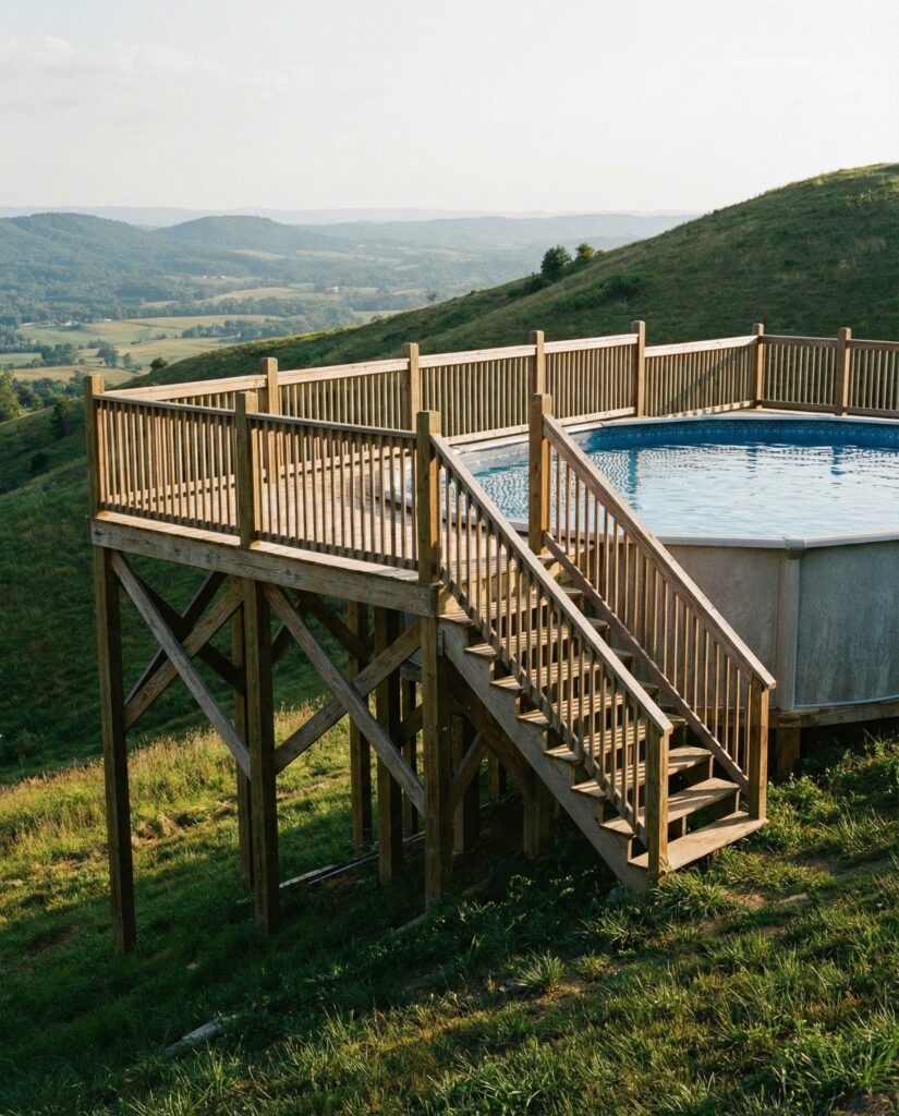 Ideas on a hill require smarter plans, especially when dealing with uneven ground. Elevated above ground pool decks use structural framing to create level surfaces while opening up views. I’ve noticed homeowners appreciate how elevation improves drainage and airflow around the pool. Designers often integrate wide stairs and sturdy railings to ensure comfort and safety. A well-executed hillside deck feels intentional, not improvised, and often becomes the visual anchor of the yard.