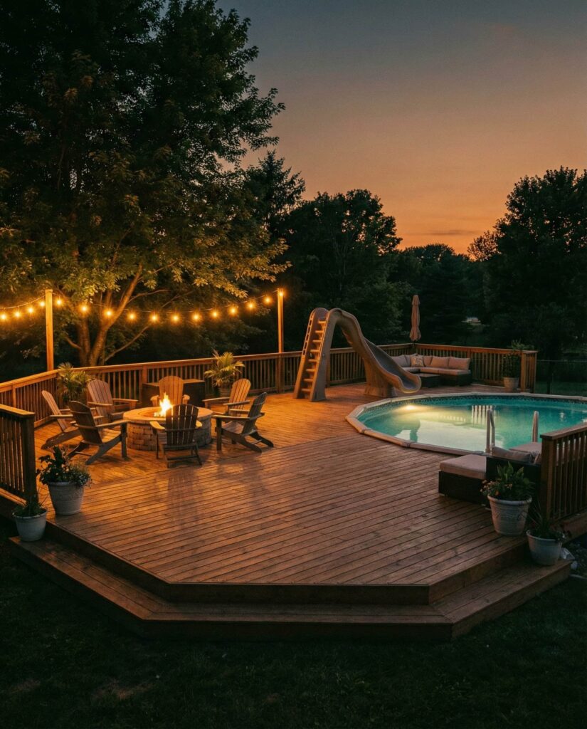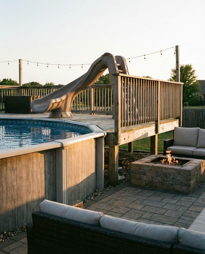Combining a fire pit and slide creates above ground pool deck ideas that stretch beyond swimming hours. These plans turn the deck into a true social zone, usable from afternoon through evening. From gatherings I’ve attended, the fire pit naturally becomes the focal point once the sun goes down. Designers stress spacing and safety, ensuring heat elements are well separated from water access. When balanced correctly, this setup feels playful without being chaotic.