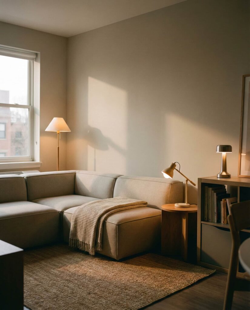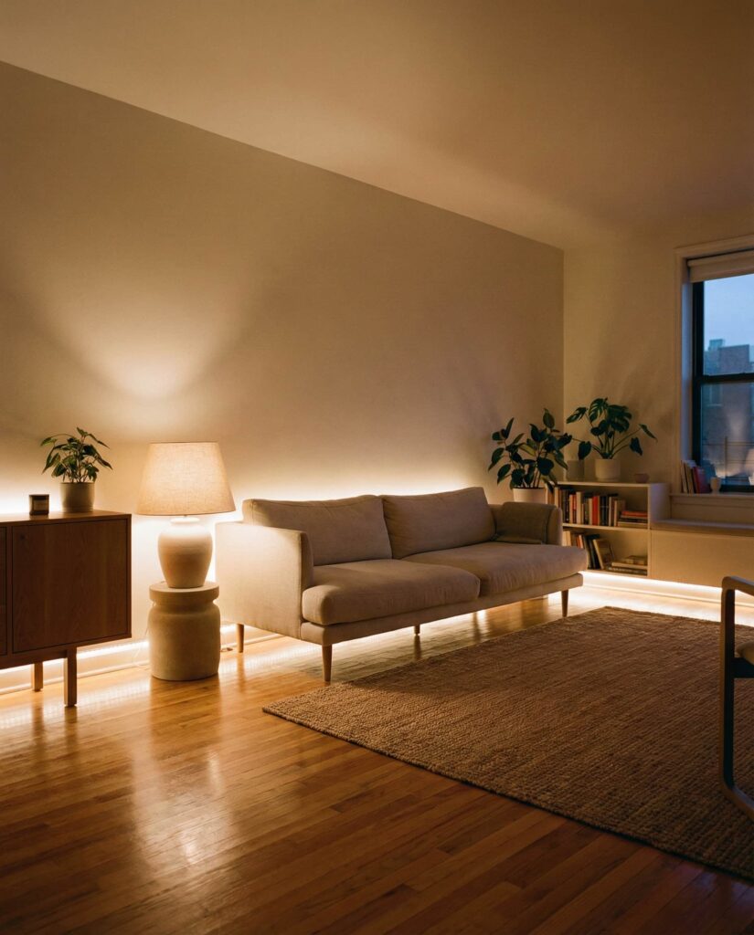 Floor-level lighting is gaining attention as one of the most underrated Ideas in apartment interior design. In a Studio or compact Living room, low-profile lamps placed near walls or furniture bases create a grounded, Cozy atmosphere that feels intentional rather than decorative. This approach adds visual depth without cluttering eye level, which is especially effective in Nyc apartments with limited square footage. Designers often recommend this Ambient technique for renters because it avoids permanent installation while still delivering a Modern and slightly Moody feel. On a Wood floor, the light gently reflects upward, softening the space and making evenings feel calm and intimate. It’s a subtle but impactful lighting plan that feels grown-up and thoughtful.