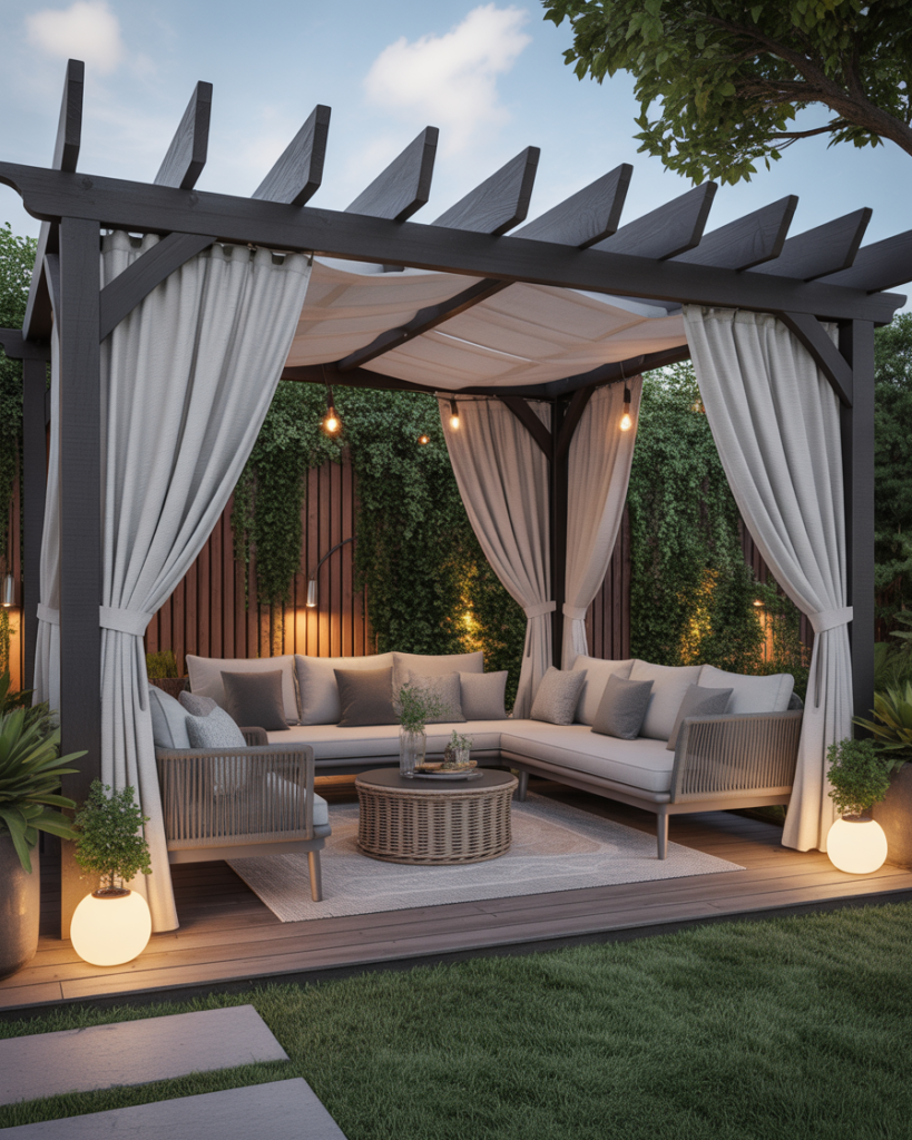 An enclosed garden-style nook works in large yards or tiny tucked-away corners, offering a naturally cozy retreat. With climbing plants, soft lights, and cushioned seating, the space feels almost like a secret outdoor room. I once built a vine-wrapped corner behind my shed, and it became my quiet place to unwind after long workdays.