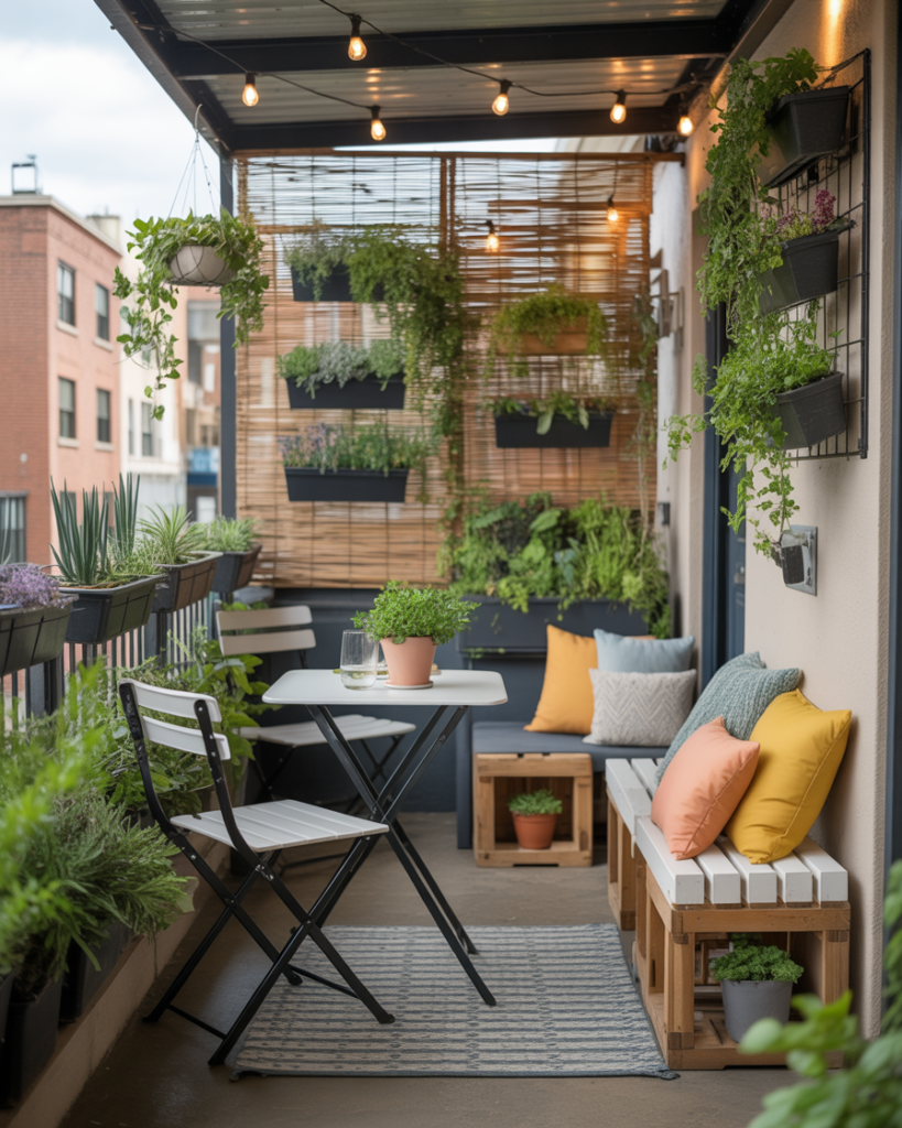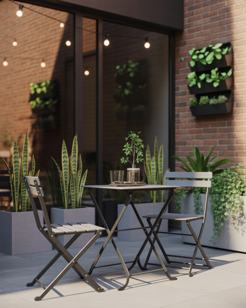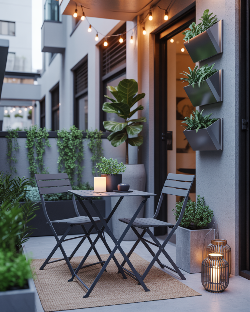 A simple bistro setup is perfect for apartment patios, especially when decorating on a budget. A foldable table, compact chairs, and plants create a functional spot even in tiny spaces. I remember a neighbor turning her narrow balcony into a European café corner using thrifted items, showing how charming small patios can be.