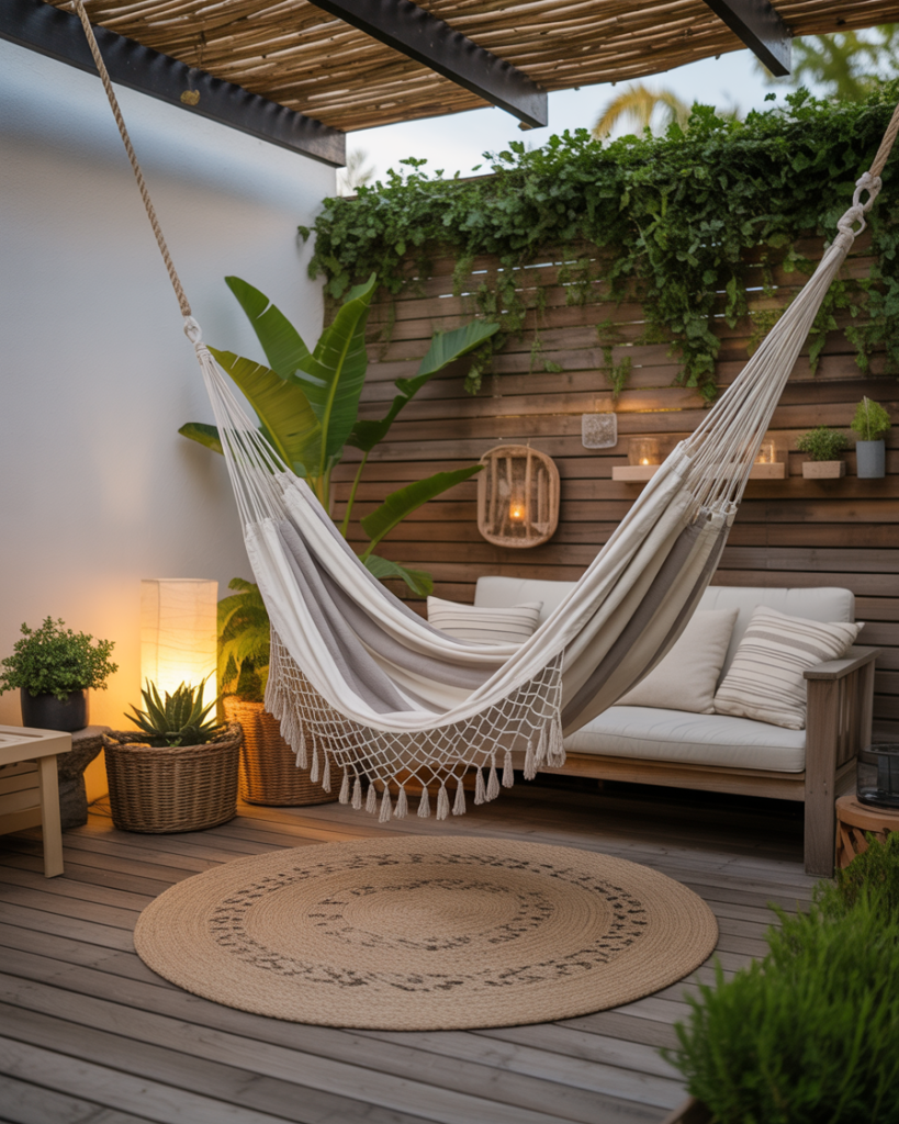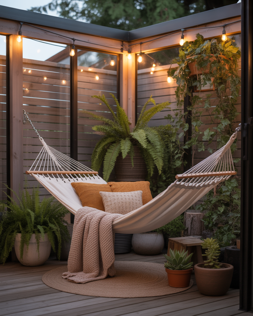 A hammock nook is a cozy escape for tiny patios, porches, or enclosed corners. With a budget diy outdoor areas approach, all you need are sturdy hooks and soft textiles. I once installed a hammock behind my garage, and it became my go-to reading spot—even though the whole upgrade cost less than dinner out.