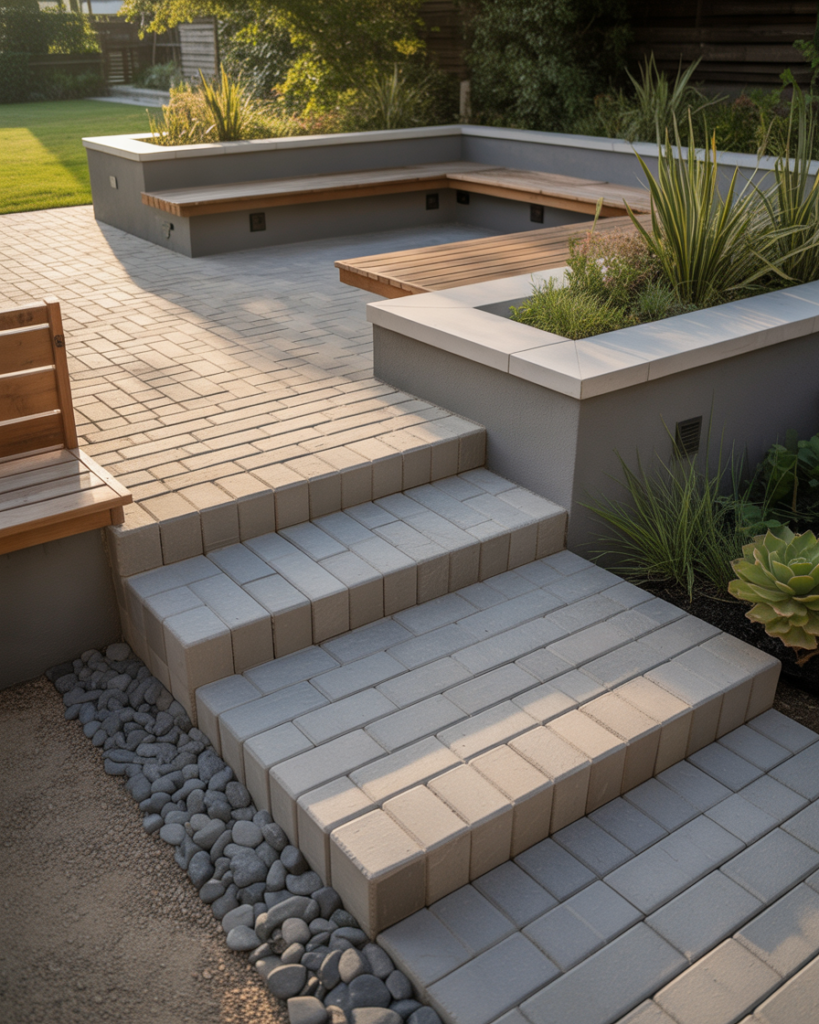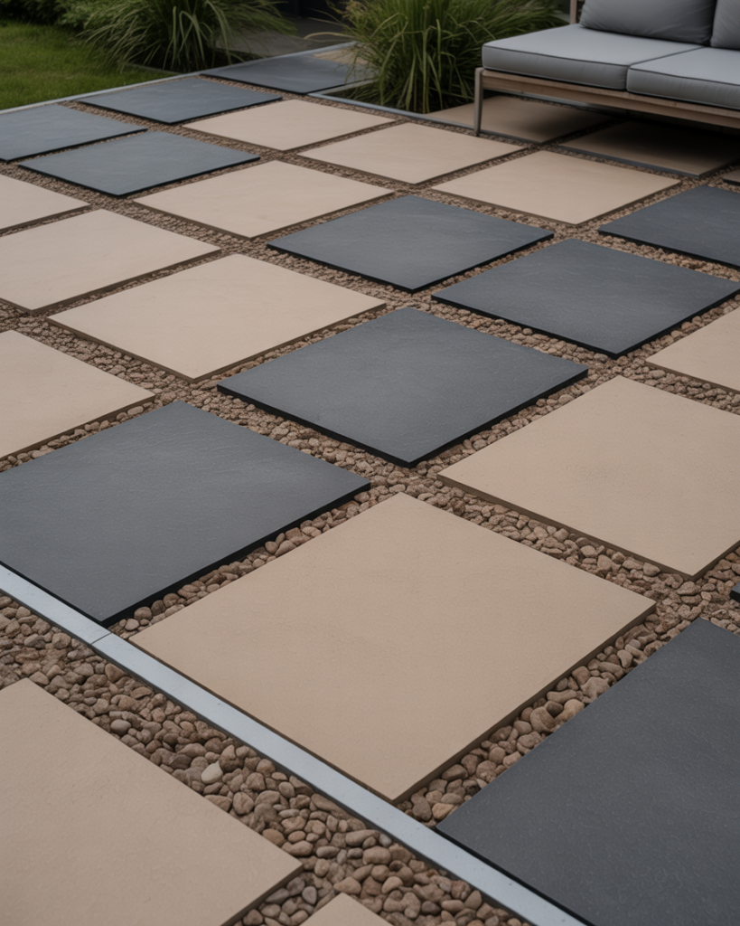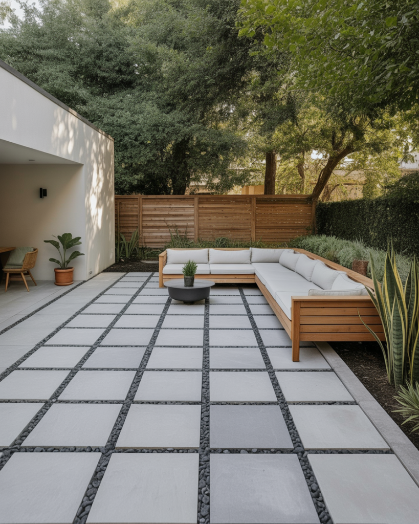 A grid of on a budget pavers creates a modern, graphic look while staying affordable. This works beautifully on large lawns or small covered patio expansions. A friend once made a grid using leftover concrete squares and gravel, and the contrast gave her backyard designer-level polish without the cost.