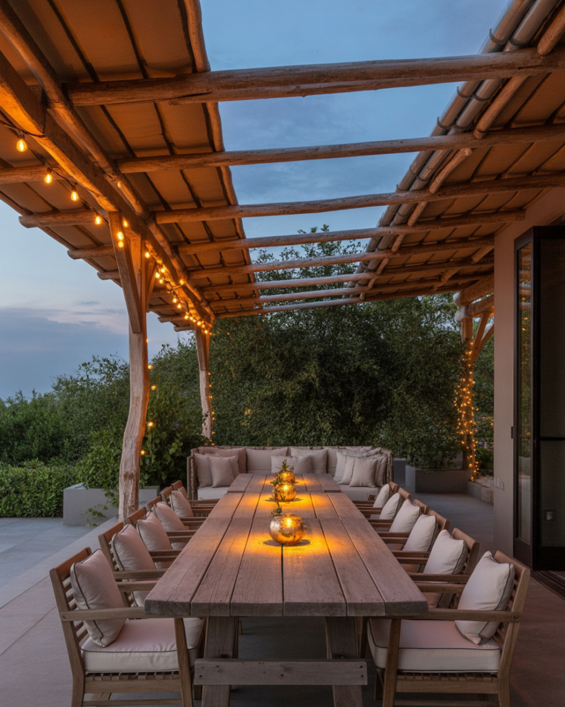 A farmhouse patio blends rustic charm with modern comfort using wood accents, lantern lighting, and covered seating. It’s ideal for outdoor dinners or relaxed mornings. My grandparents’ old porch taught me how simple materials add soul to a space, and today the style remains accessible even on a budget, making any yard feel grounded and welcoming.