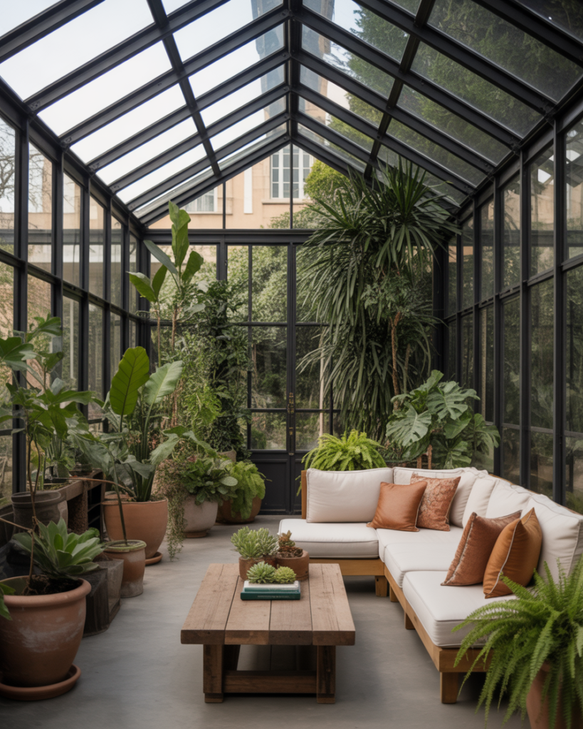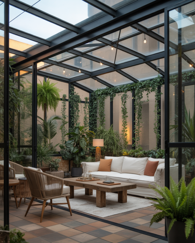 An enclosed greenhouse patio blends gardening with leisure—great for apartment patios or backyard corners. Using thrifted shelves and pots keeps it on a budget. I once built a tiny glass-panel shelter for plants, and it accidentally became my favorite place to drink morning coffee.