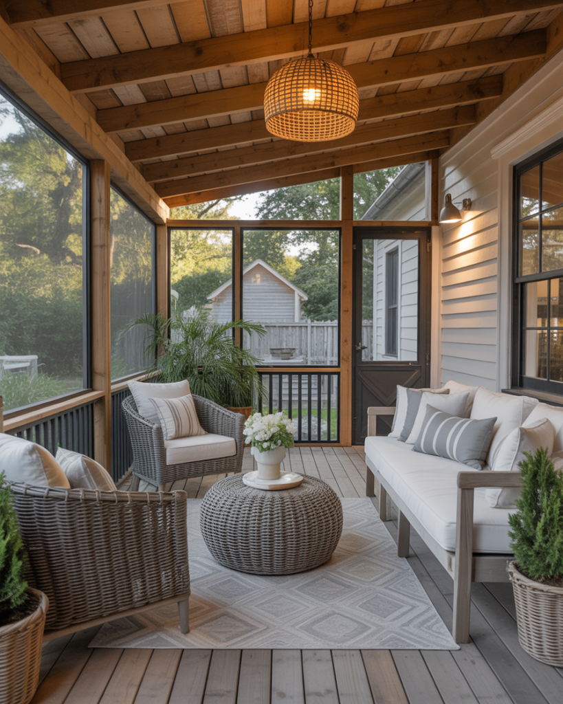A screened in patio brings indoor comfort outdoors—a favorite in farmhouse features championed by Joanna Gaines. It’s perfect for humid climates or areas thick with insects, allowing you to unwind in a cozy and protected space. Whether attached to covered porches or added to existing decks and porches, it creates a calming zone that feels like an extra room.