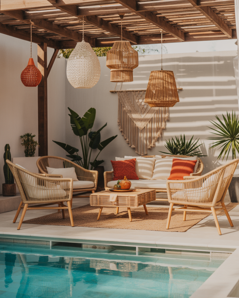 A relaxed boho patio with pool edges creates a warm, eclectic atmosphere, from full-size pools to compact dipping pool setups. This style thrives on layered textures and cheap décor like woven lanterns and rattan seating. A neighbor once transformed her poolside area with thrifted accessories alone, turning it into a dreamy retreat perfect for summer nights.