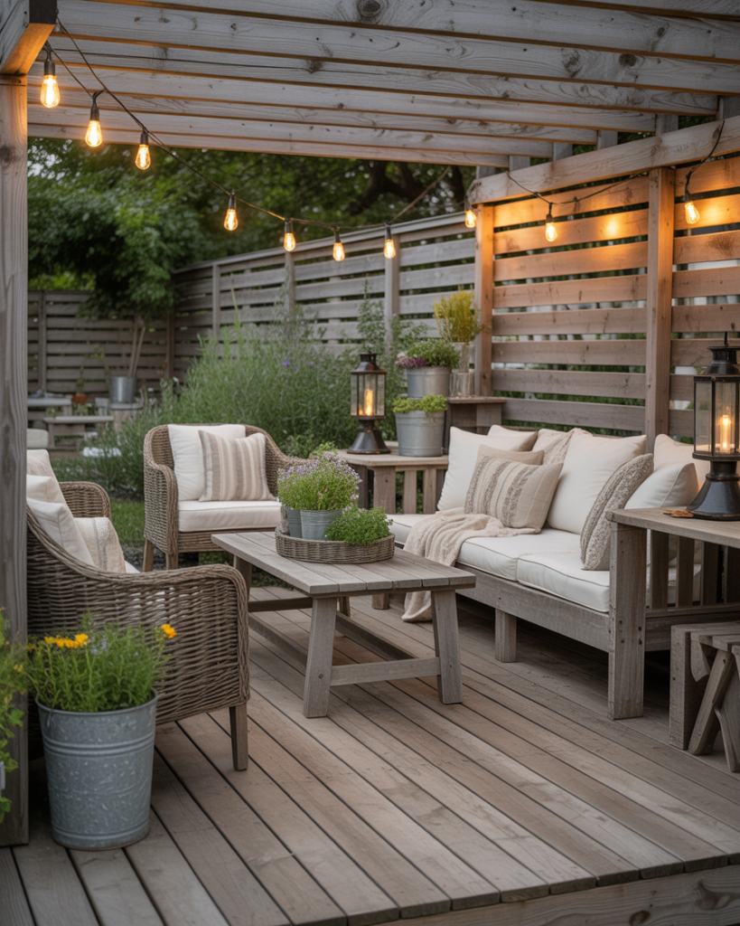A covered lounge is one of the easiest ways to build a cozy escape on a budget diy deck decorating outdoor layouts. This style works beautifully on covered porches, compact patios, or apartment balconies where shade and softness matter. I remember helping a friend hang sheer curtains under her pergola—an inexpensive change that suddenly made her yard feel like an outdoor living room.