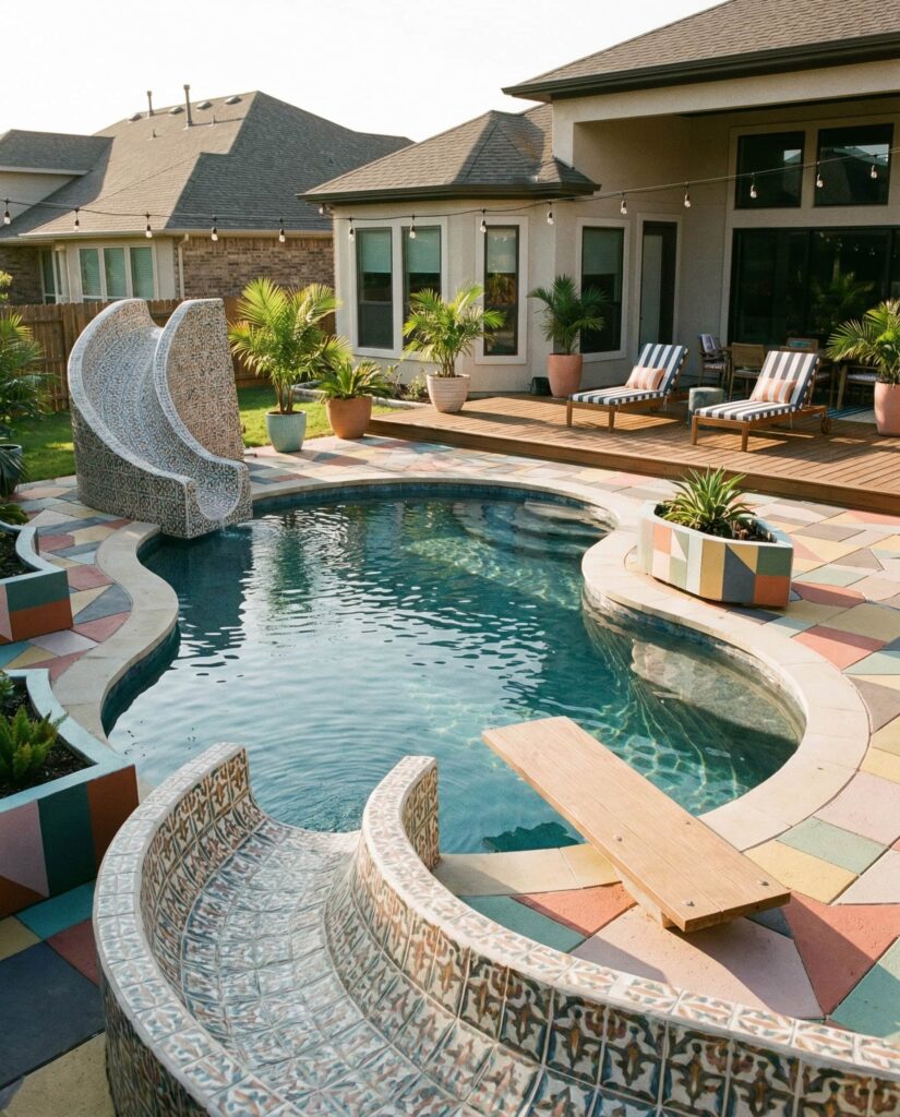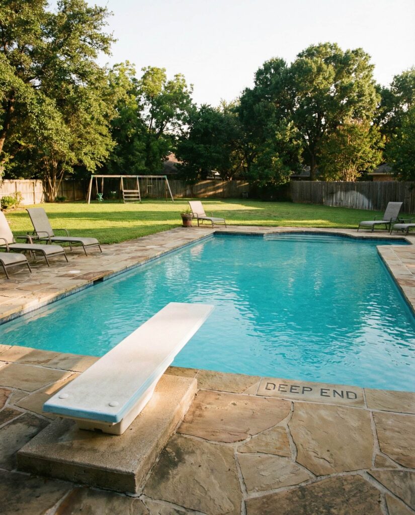 Including a Diving board requires thoughtful depth planning, but it adds timeless fun for active households. These Family-friendly designs often separate diving zones from lounging areas for safety. I’ve seen this approach work well in larger suburban yards where play is a priority. Designers emphasize balance so the board feels integrated, not like an afterthought.