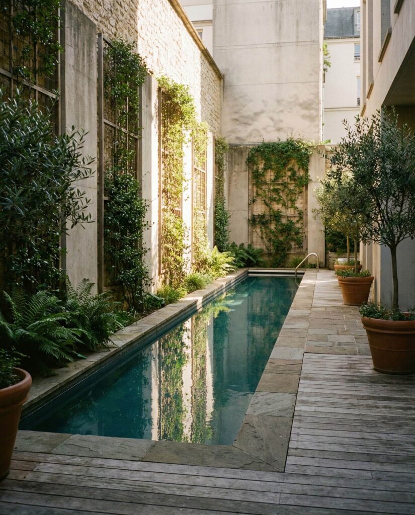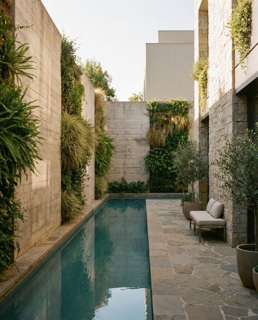 A Narrow courtyard pool is designed for tight urban lots where every foot matters, yet homeowners still want a refined water feature. These ideas often rely on linear forms, vertical landscaping, and reflective surfaces to visually expand the space. I’ve seen architects in cities recommend this solution because it turns an overlooked side yard into a calm retreat without major structural changes. With smart lighting and slim coping, the pool feels intentional rather than squeezed in, making it ideal for townhouses and renovated older homes that crave outdoor relief.