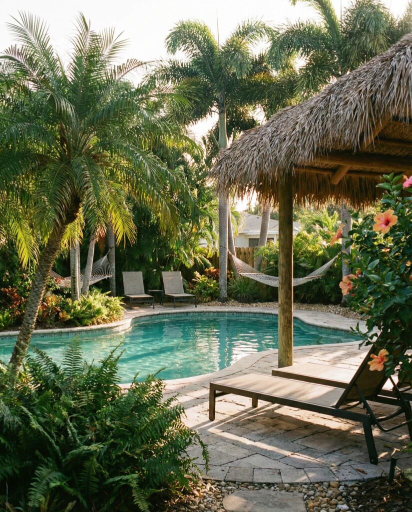 A Florida inspired backyard pool leans into greenery, humidity, and relaxed resort energy. These Natural designs often feature palm-filled landscaping, freeform edges, and shaded lounging zones. I’ve noticed homeowners choosing this style to blur the line between vacation and daily life, especially in coastal or subtropical regions. Designers often reference boutique hotels, focusing on comfort and flow rather than symmetry.
