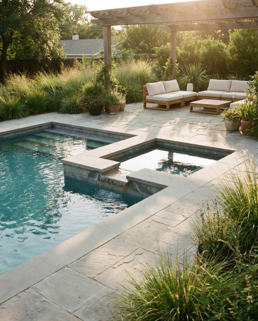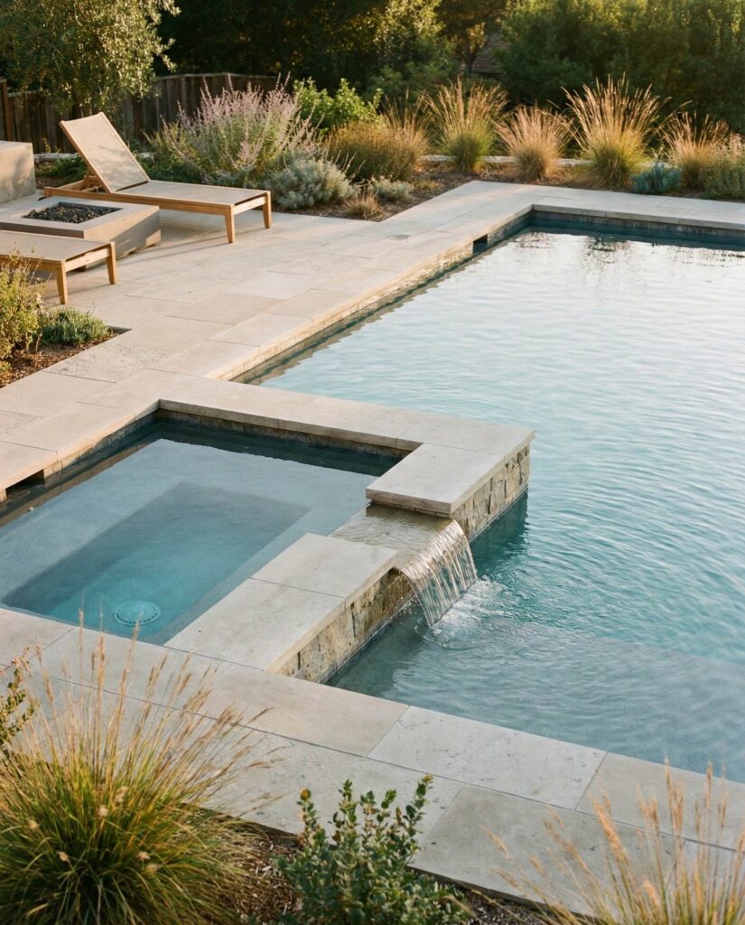 A pool with hot tub built directly into the layout adds year-round usability without expanding the footprint. These Modern designs appeal to homeowners who value comfort after work or workouts. I’ve seen designers recommend raised spa edges or shared water features to unify the look. It’s a practical upgrade that feels indulgent but remains grounded in everyday use, especially for couples or empty nesters.