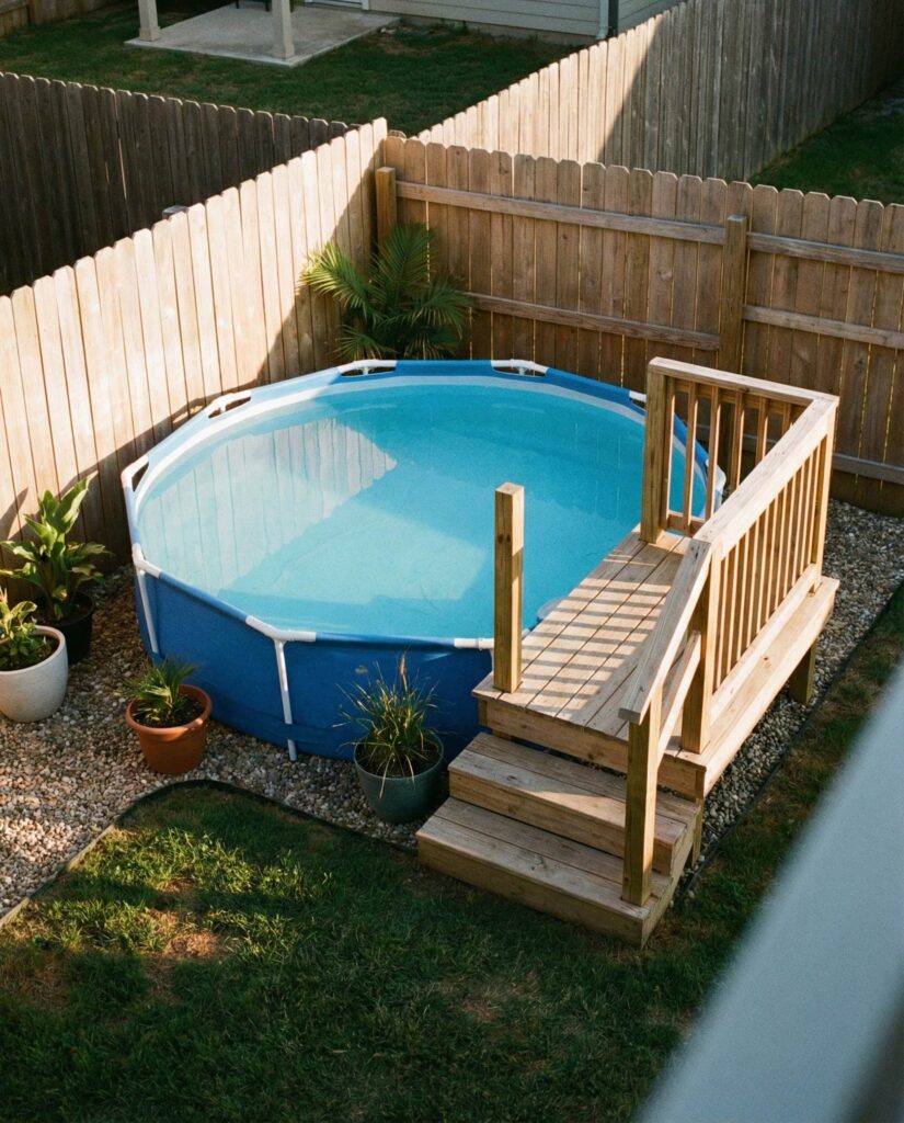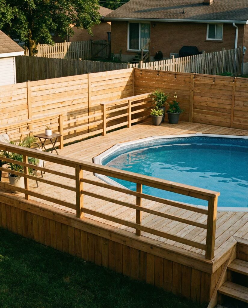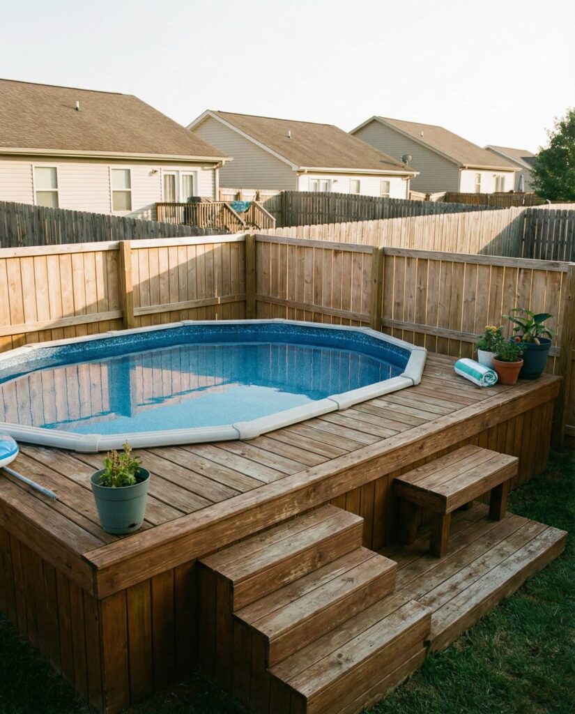 An above ground pool paired with a partially sunken deck bridges the gap between in-ground and raised designs. These ideas appeal to homeowners seeking comfort without full excavation. I’ve noticed builders recommending this for uneven terrain or faster installation timelines. The deck visually anchors the pool, making it feel cohesive and intentional.