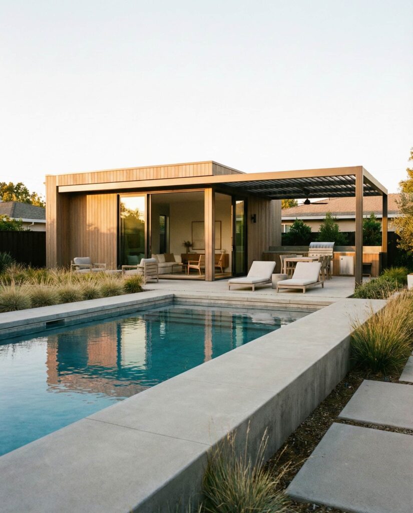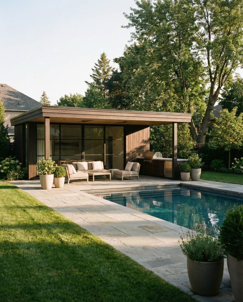 A Modern pool combined with a multifunctional Pool house extends outdoor living beyond swimming. These designs often include shade, storage, and quiet retreat zones. I’ve seen homeowners treat the pool house like a summer living room, ideal for work breaks or evening gatherings. Designers stress clean lines and continuity between structures for a seamless look.