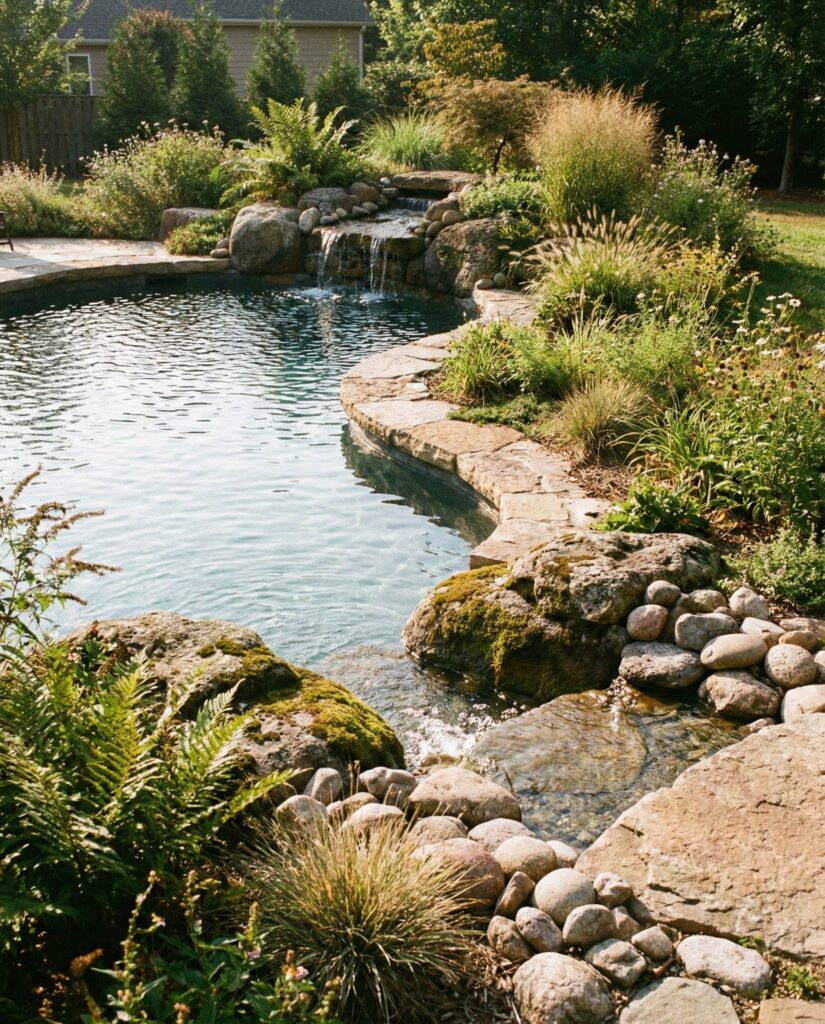 A Natural pool design focuses on organic shapes, stone textures, and integrated Waterfalls, creating an experience closer to swimming in a pond than a resort. These ideas appeal to homeowners who prioritize sustainability and immersive ideas landscaping over sharp lines. I’ve seen this approach succeed particularly well in Country settings or wooded suburbs, where the pool feels like part of the land rather than an addition. Designers often reference European spa traditions, but the concept translates beautifully to American backyards seeking calm and privacy. Native plants, gravel edges, and subtle circulation systems keep the pool visually soft while remaining functional and safe for daily use.