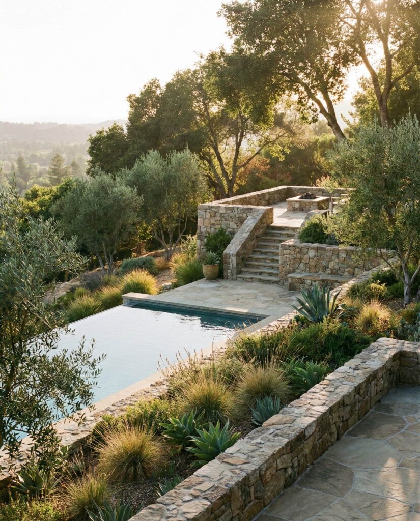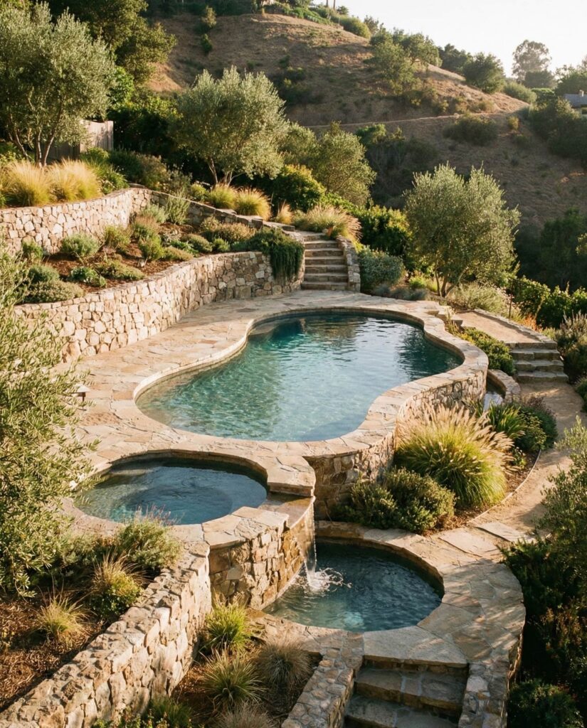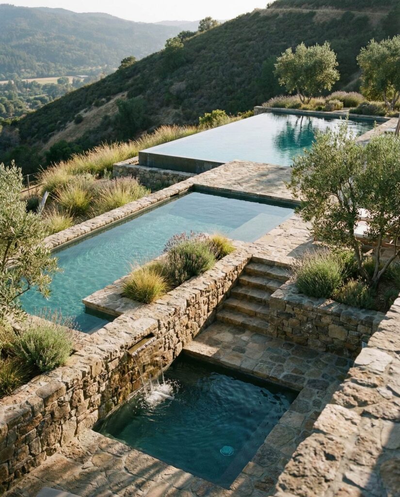 Designing a pool on a slope or A slope turns a challenge into a visual advantage. Instead of flattening land, architects use elevation to create dramatic levels, infinity edges, or terraced seating. I’ve seen this approach transform otherwise unusable yards into standout features, especially in hilly regions. Retaining walls, smart drainage, and layered landscaping make the pool feel intentional rather than forced. This idea suits homeowners who want something distinctive without excessive ornamentation, proving that thoughtful engineering can be as beautiful as decoration.