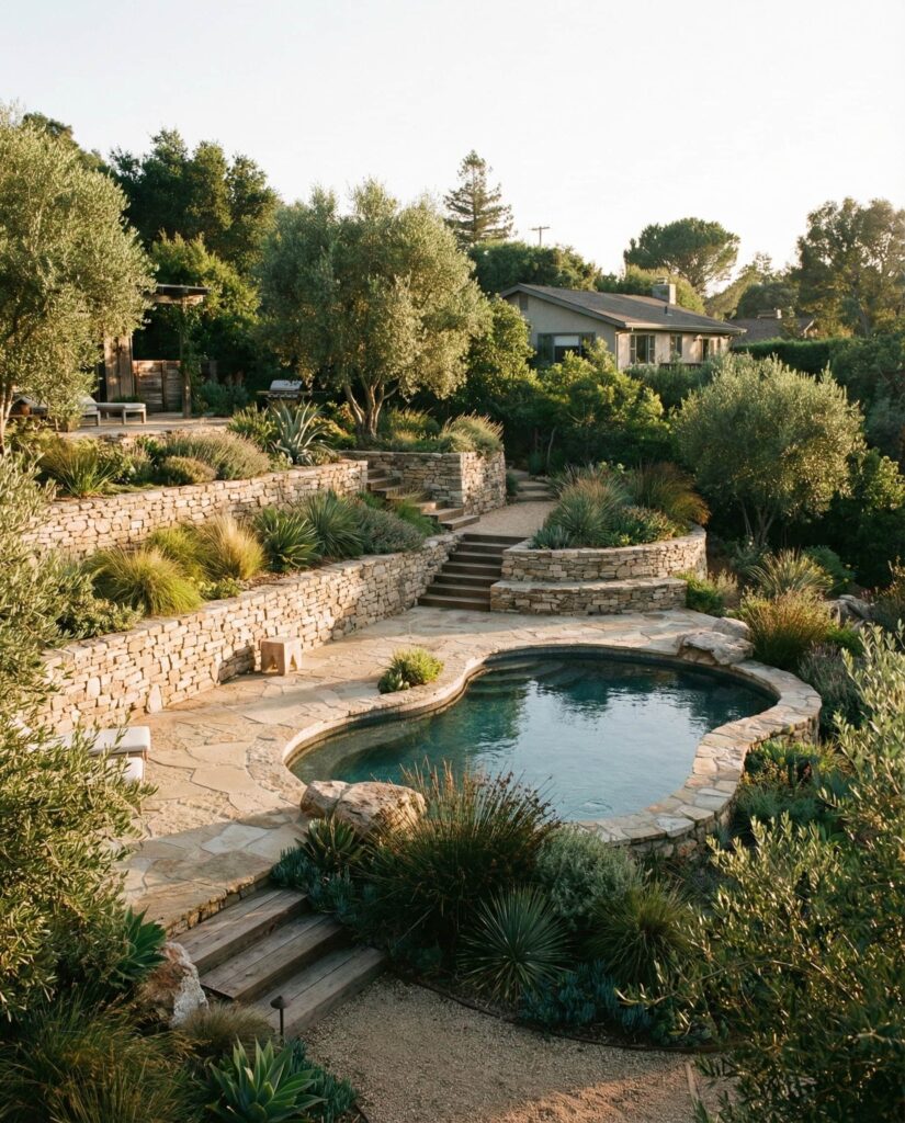 A pool built on a slope using terraced levels blends engineering with Natural design. These ideas landscaping solutions use steps, planters, and layered materials to soften elevation changes. I’ve observed that homeowners appreciate how this approach feels organic rather than forced. It’s especially effective in hilly neighborhoods where flat lawns are rare but views are abundant.
