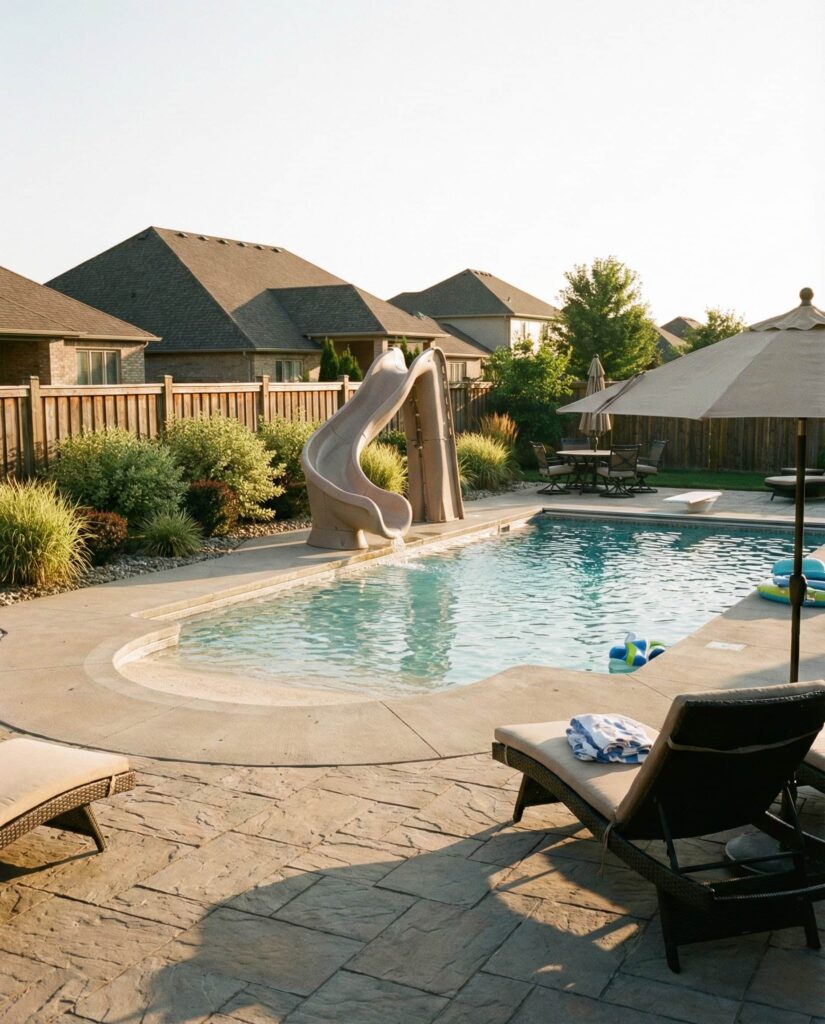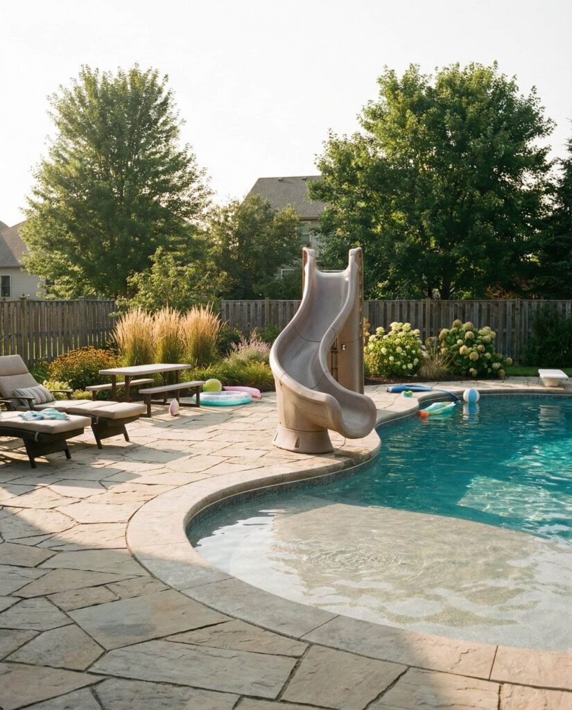 A Family-friendly pool with slide continues to be a favorite for households that actually use their backyard daily. Unlike luxury showpieces, this style prioritizes play, safety, and shared memories, often including shallow entries and durable finishes. I’ve watched neighbors design these pools to grow with their kids, adding a Slide that feels exciting without overwhelming the space. Designers featured on Pool & Spa News often stress thoughtful zoning, so adults can relax while kids play. This concept works across climates and is especially popular in suburban developments where outdoor living replaces screen time during warmer months.
