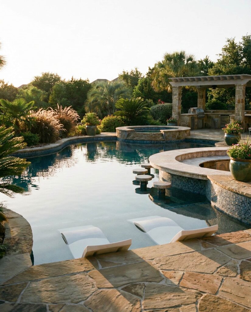 A Luxury pool with hot tub and Swim up bar brings resort living home, a trend heavily featured by designers in Australia and the U.S. Southwest. This idea appeals to homeowners who entertain often and want their backyard to feel like a boutique hotel. I’ve noticed that successful designs balance indulgence with comfort, using shade, seating, and durable finishes. Rather than feeling flashy, the best examples feel relaxed and social, especially when paired with subtle lighting and quality materials. It’s a statement, but one rooted in usability.