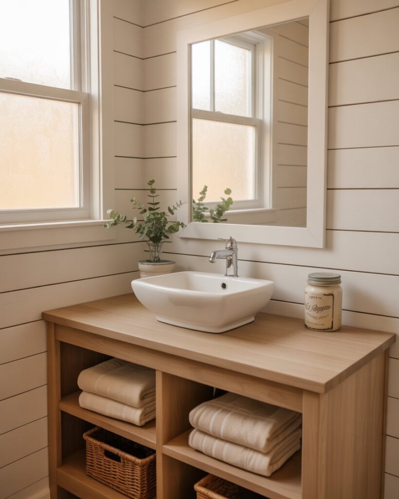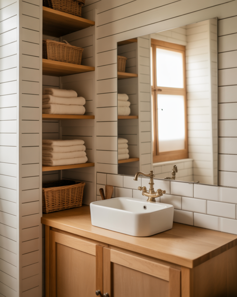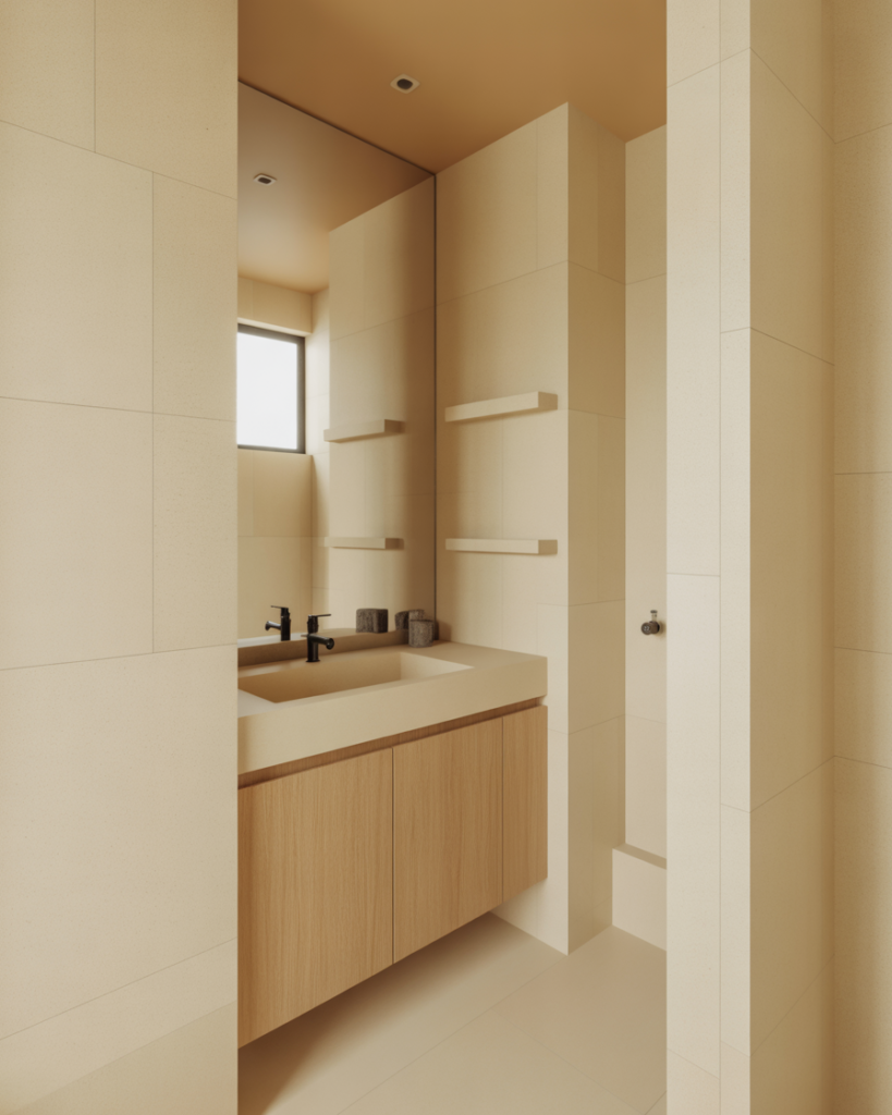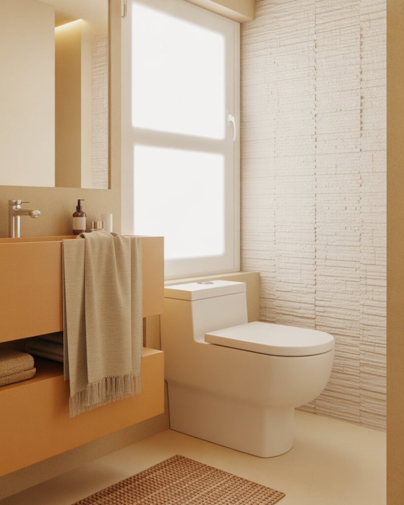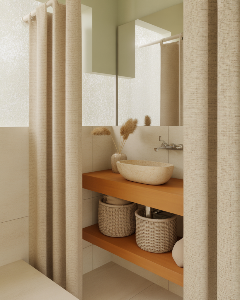 A modern earth-linen look blends soft neutrals, woven textures, and warm colors for a grounded yet airy feel. Ideal for small bathrooms, this theme brings quiet comfort while keeping the space modern and uncluttered. Light woods and linen-like finishes add gentle warmth without overwhelming the room.