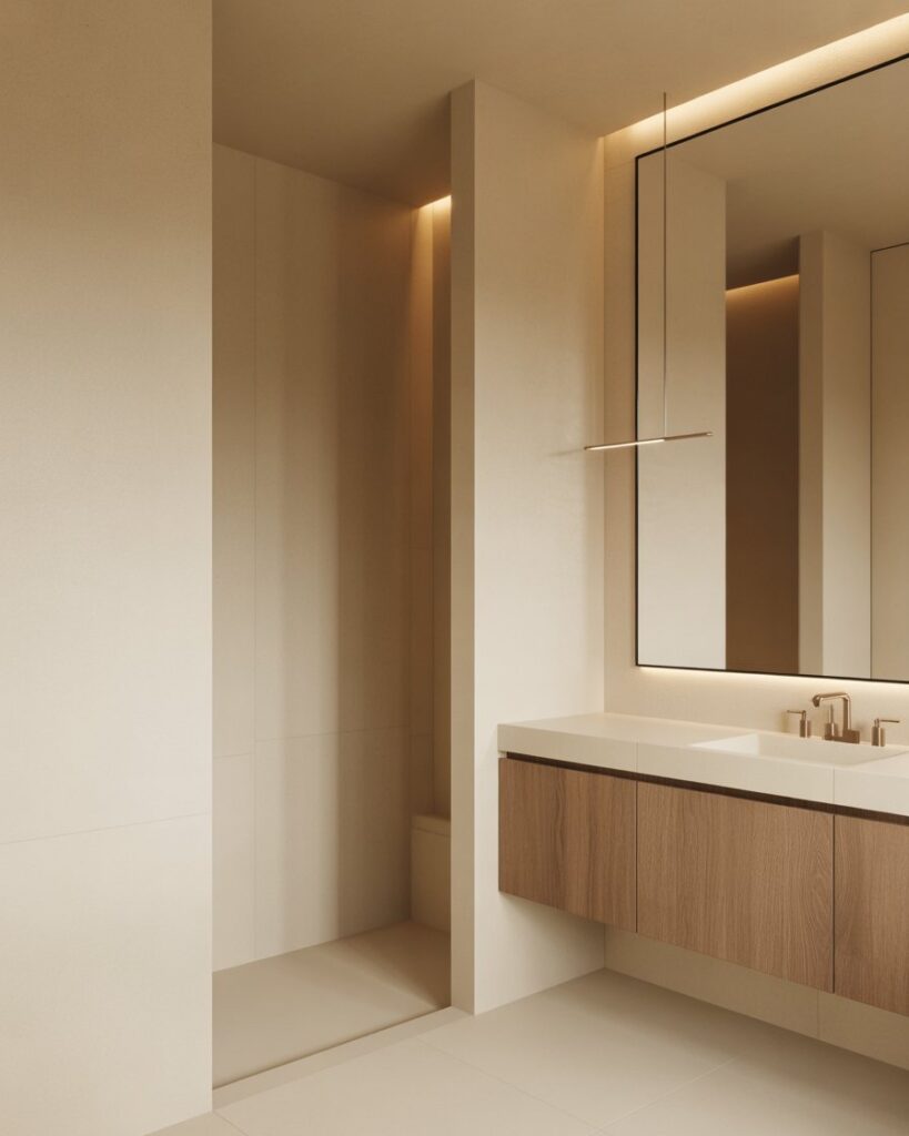 A Minimalist bathroom in soft colors creates calm, especially in small spaces where clutter builds quickly. This look pairs natural woods with clean lines to add warmth, making it ideal for an Apartment or anyone seeking simplicity without sterility. It blends serenity with everyday comfort and feels effortlessly modern.