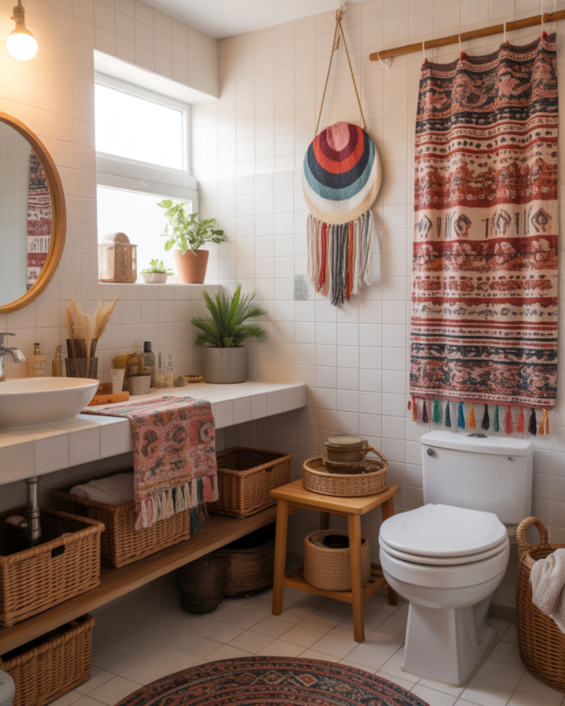 A Bohemian or Boho style thrives on layered textures, vibrant colors, and eclectic accents that feel expressive yet cute. It works beautifully for small bathrooms, turning functional rooms into creative, personal spaces. Natural materials add warmth, while patterns introduce lively energy.