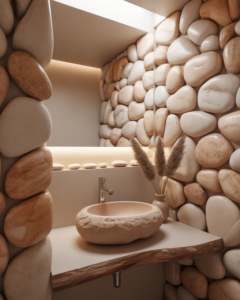 An Organic stone retreat brings a grounded, calming presence to any bathroom. Natural textures, soft earth colors, and rounded forms create a gentle flow ideal for small bathrooms. It’s a look that feels handcrafted, serene, and deeply connected to nature while staying on a budget when using composite stone alternatives.