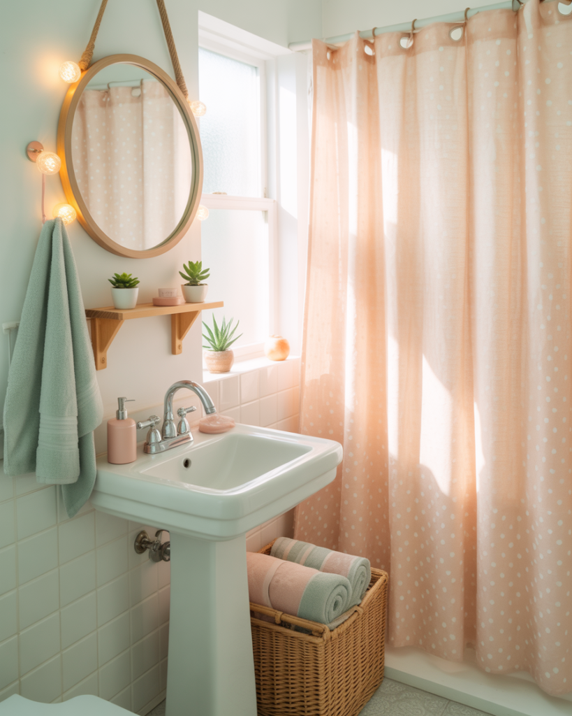 A Cute pastel bathroom uses soft blush, mint, or lavender colors to add charm without overwhelming the room. This approach brightens small spaces and pairs well with simple décor. It’s a playful idea that offers a light, joyful mood and works perfectly on a budget using paint and small accessories.