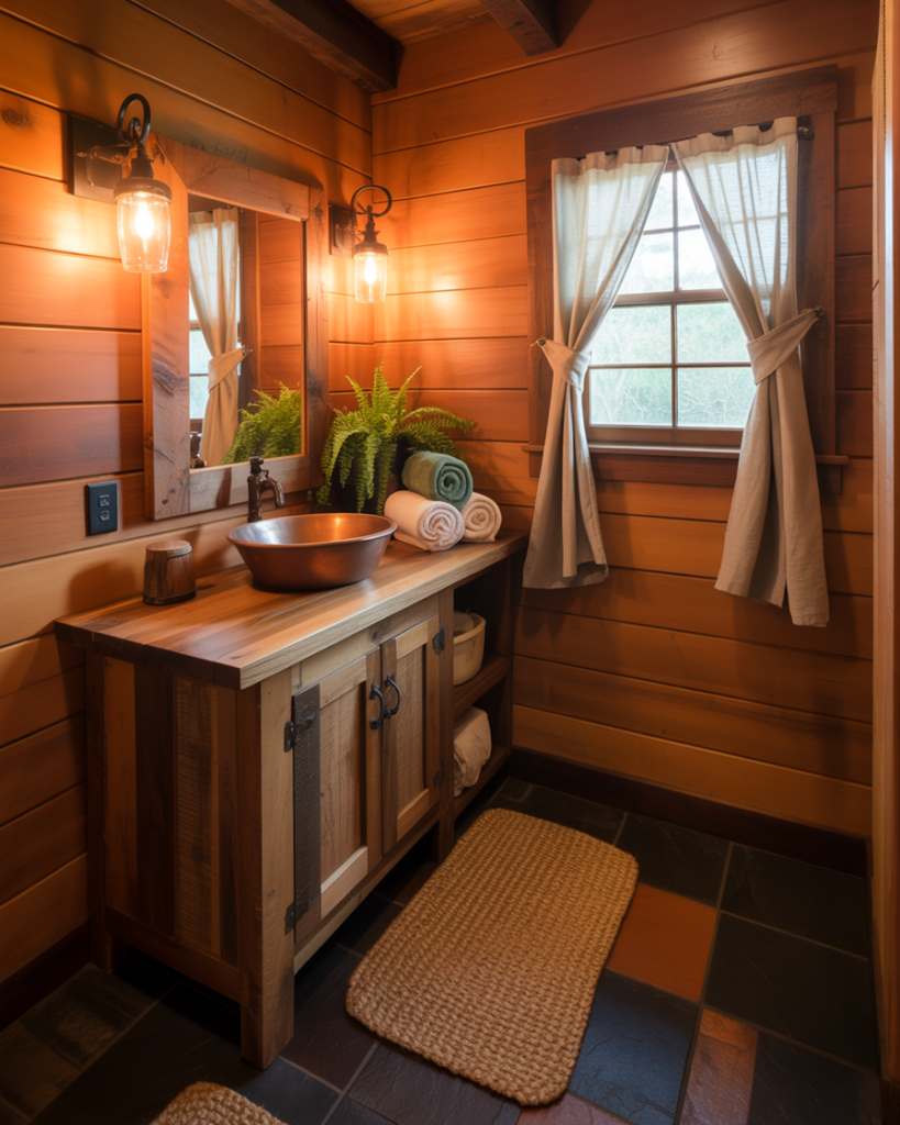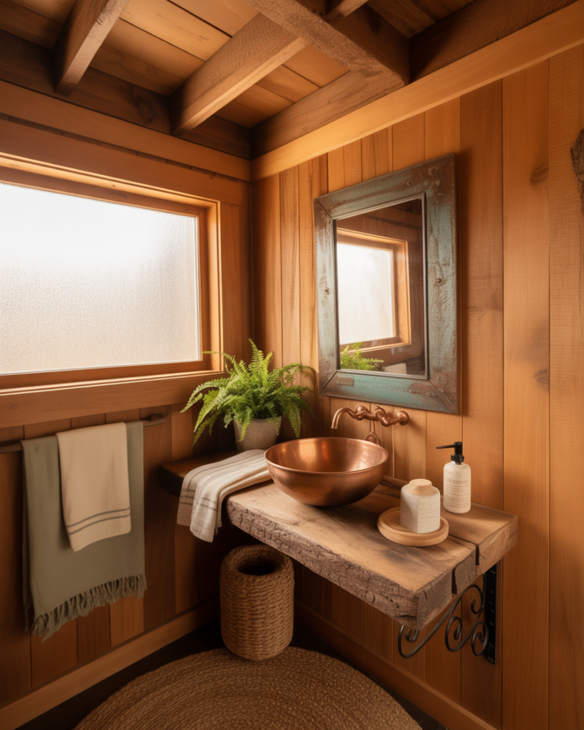 A Rustic cabin-inspired design introduces warm woods, iron fixtures, and cozy textures. It’s great for small bathrooms seeking personality, and brings a handcrafted authenticity that feels comforting. This style blends well with earthy colors, creating a snug retreat with character.
