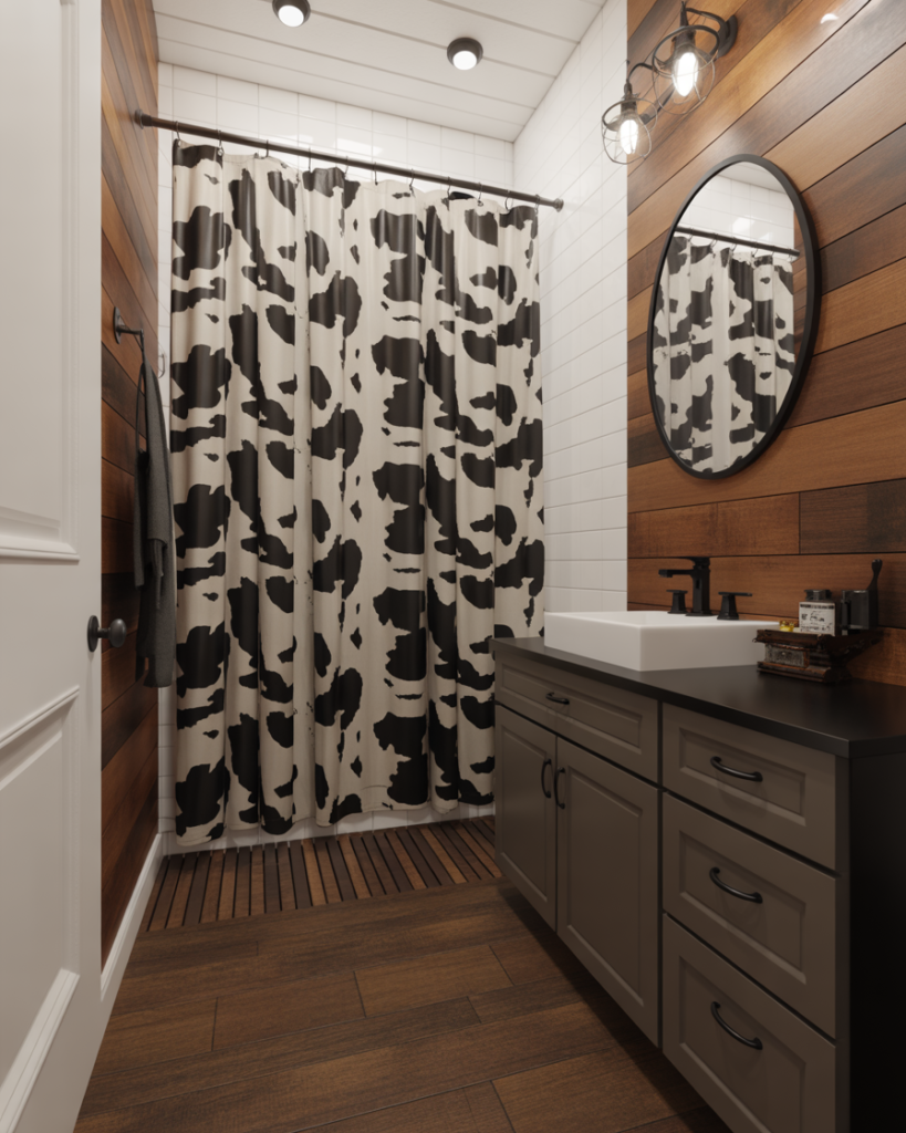 A Cow-inspired Western look adds whimsy and bold contrast. Whether through wallpaper or small accents, this pattern brings a playful twist that pairs well with black hardware and warm woods. It’s especially fun in powder rooms where guests appreciate unexpected design touches.