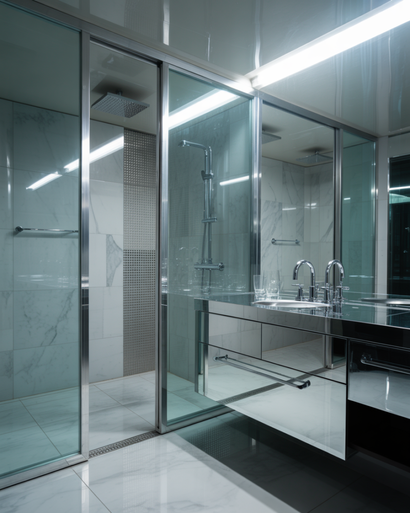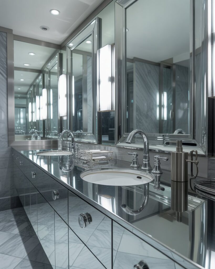 A Luxurious Silver interior uses reflective finishes and sleek surfaces to create a glamorous, elevated mood. This style suits both full and half baths, adding brightness and depth through cool metallic colors. It’s a polished look that instantly modernizes a home with minimal effort.