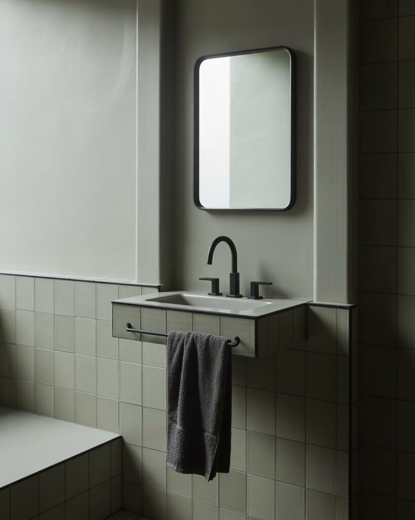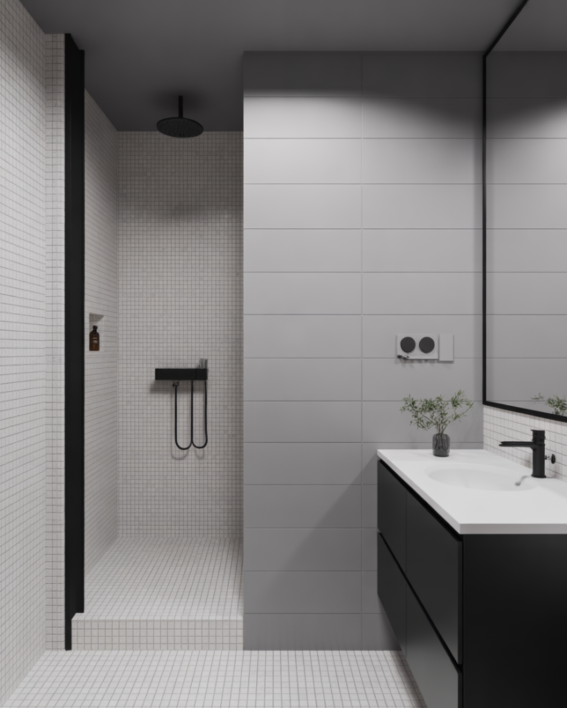 An Aesthetic monochrome theme focuses on soft grays, off-whites, and matte black details to create harmony. This balanced palette makes it perfect for small bathrooms, offering a clean, restful look that feels timeless. Simple lines and cohesive tones keep the space visually calm and easy to maintain.