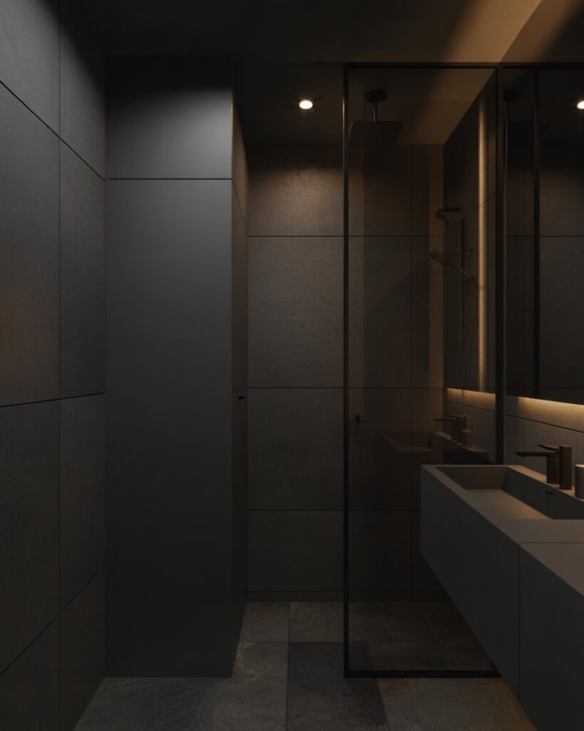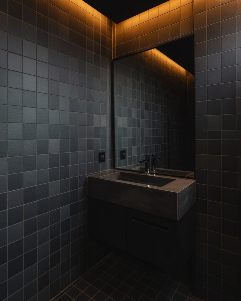 A Black-centered modern bathroom uses dark textures and warm lighting to create drama and intimacy. Surprisingly effective in small spaces, this approach gives depth and style while maintaining functionality. Mixed materials—stone, matte finishes, subtle metallics—add a sophisticated edge.