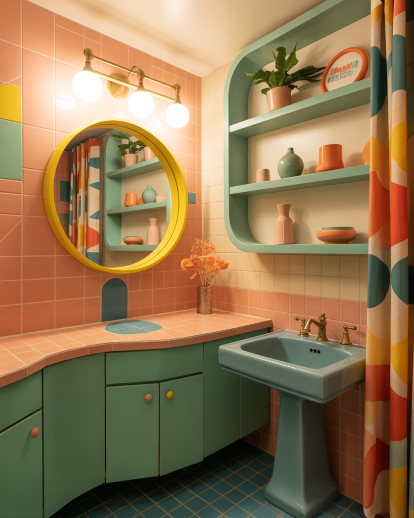 A Colorful retro-inspired bathroom adds joyful personality while staying on a budget. Rounded shapes, playful tones, and nostalgic details echo the vibrant charm highlighted by editors at Design Milk. It fits well in small spaces, where even modest pops of color can create a lively, memorable feel without overwhelming the room.