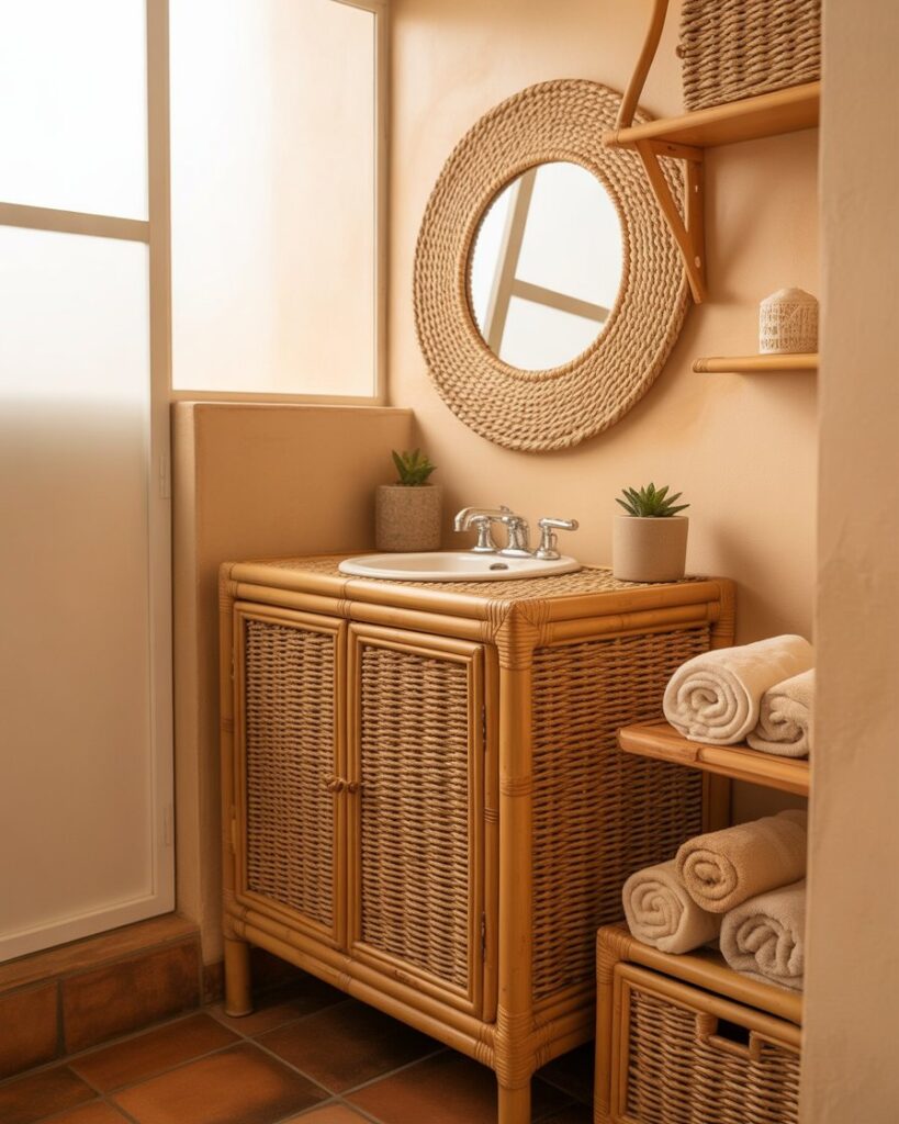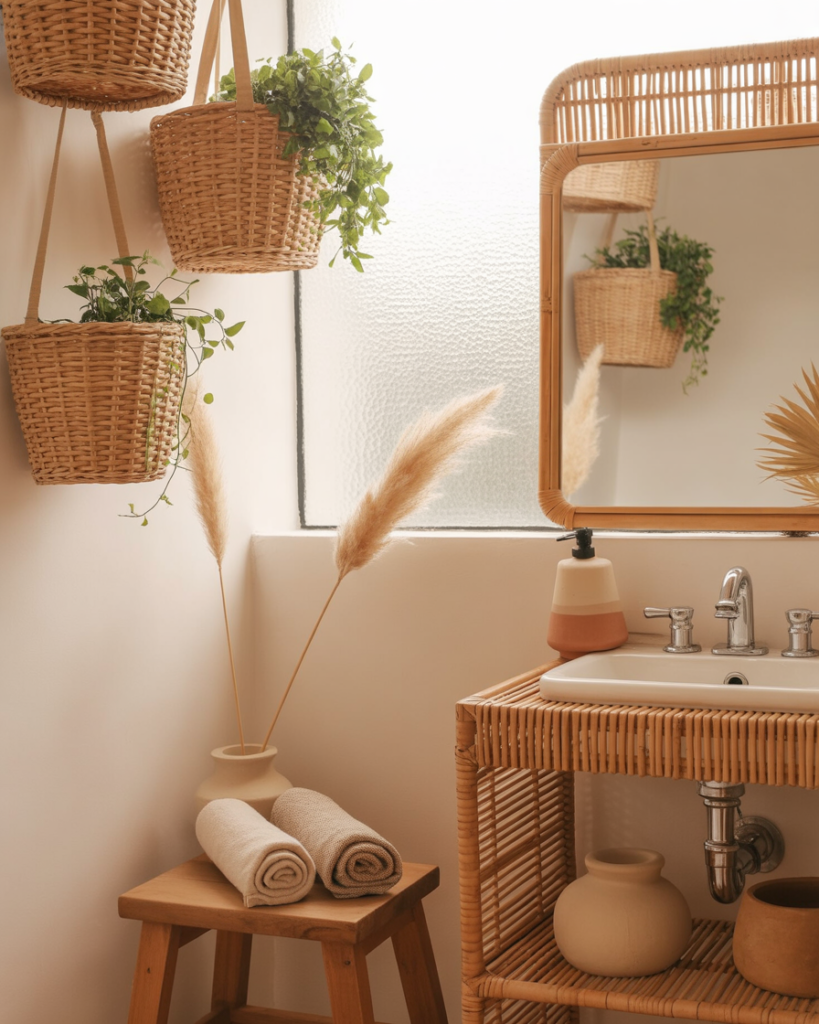 A Boho rattan-forward look brings woven textures, airy neutrals, and natural warmth. It’s especially charming for small bathrooms, adding personality without clutter. Organic materials soften hard surfaces, creating a relaxed, expressive mood that suits casual homes with comfort at the forefront.