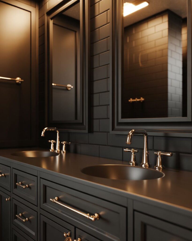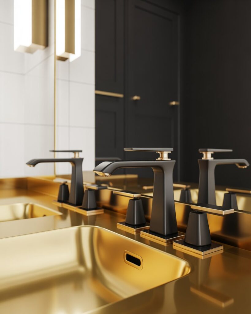 The Black and gold palette remains irresistibly elegant, adding chic drama to both full and half baths. Matte black hardware paired with glowing brass brings boutique sophistication designers like Shea McGee often celebrate. This look works for modern renovations or small refreshes, instantly elevating the atmosphere.