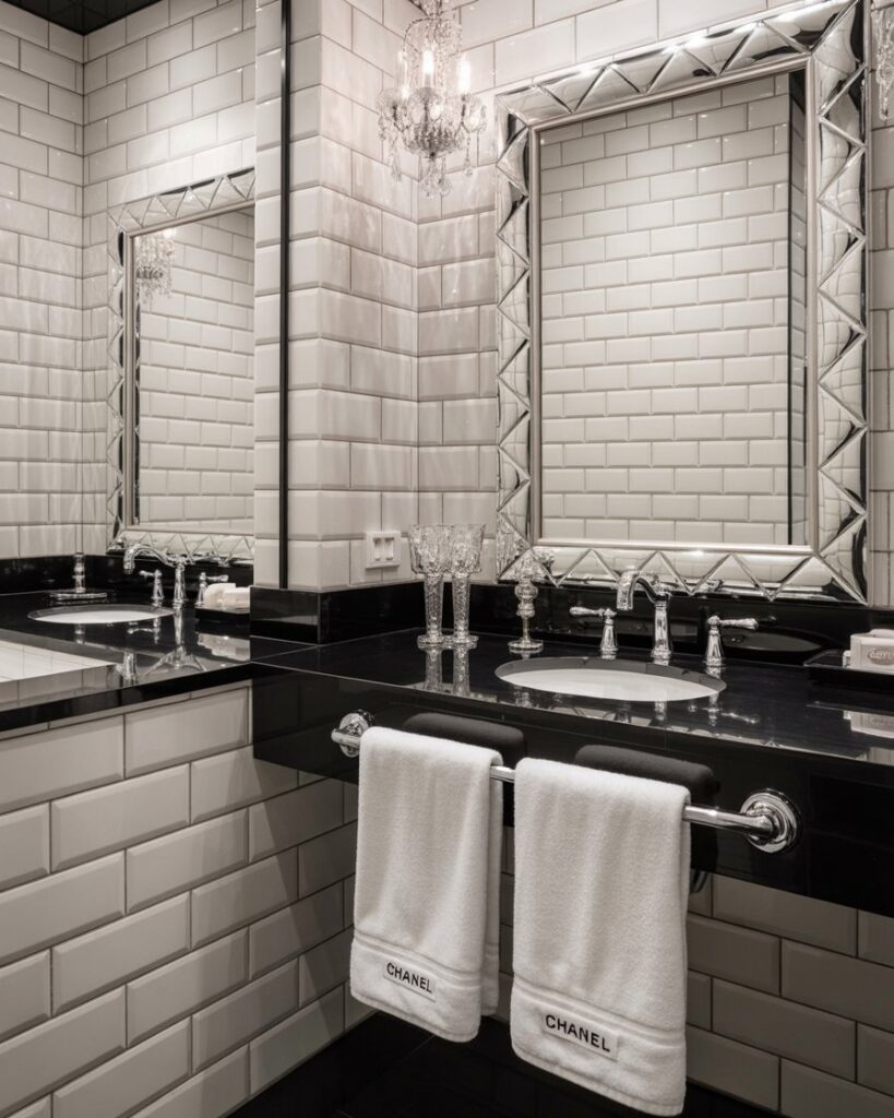 A Chanel-inspired design brings couture-level sophistication with monochrome contrasts, quilt-like motifs, and luxurious touches accented in silver. This style suits anyone who appreciates timeless fashion elegance and wants their bathroom to feel polished, confident, and classically refined.