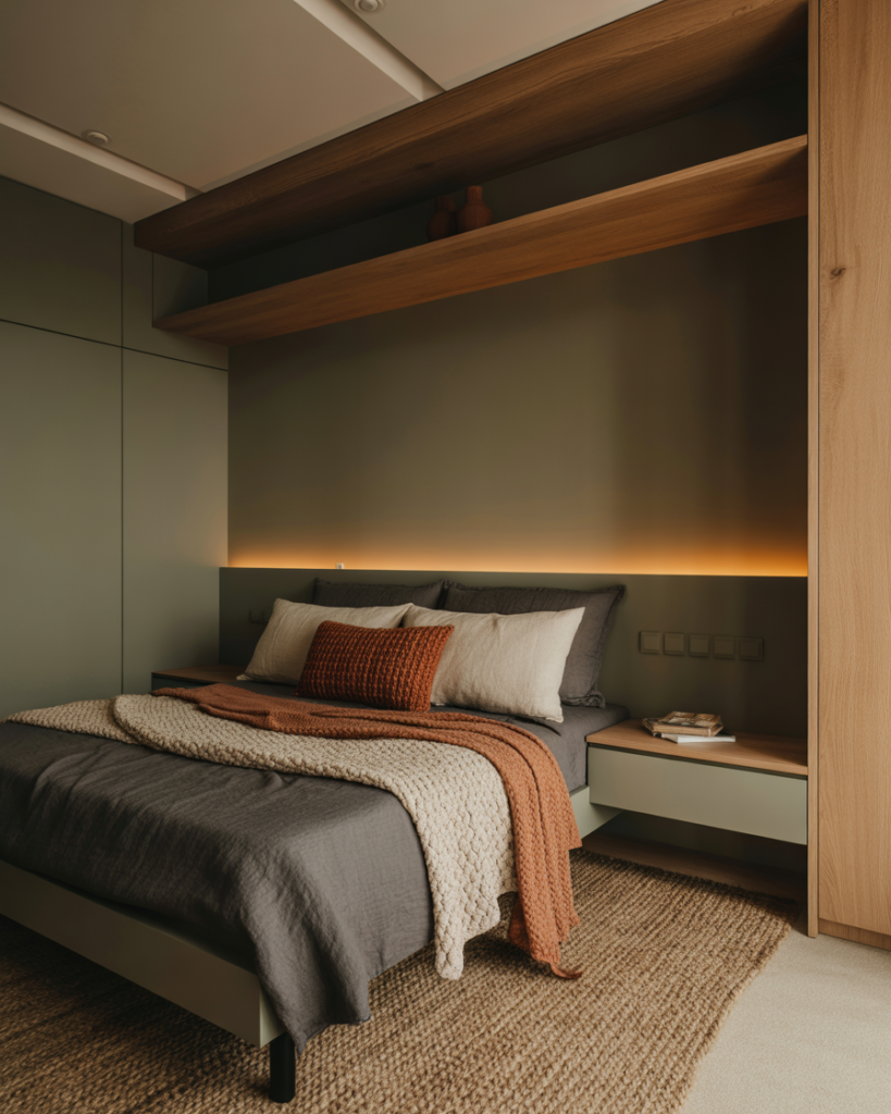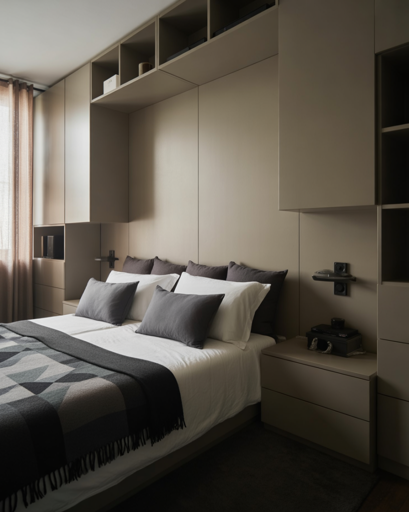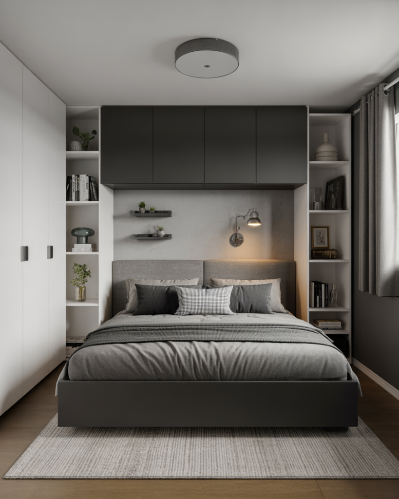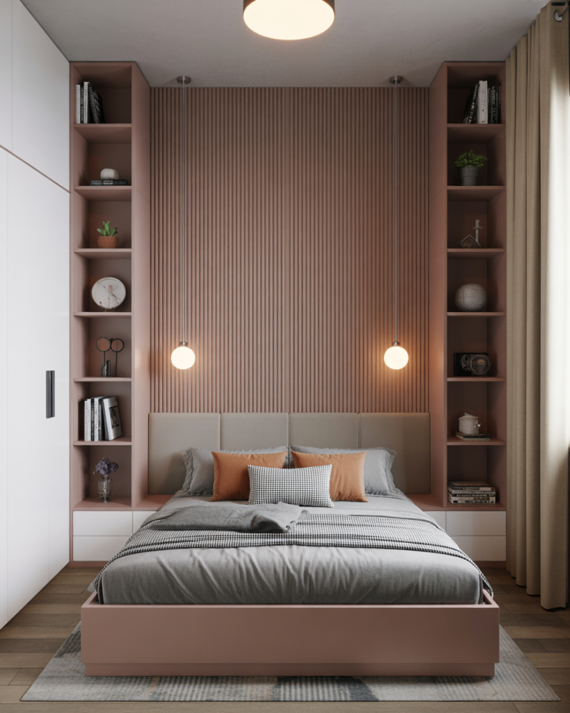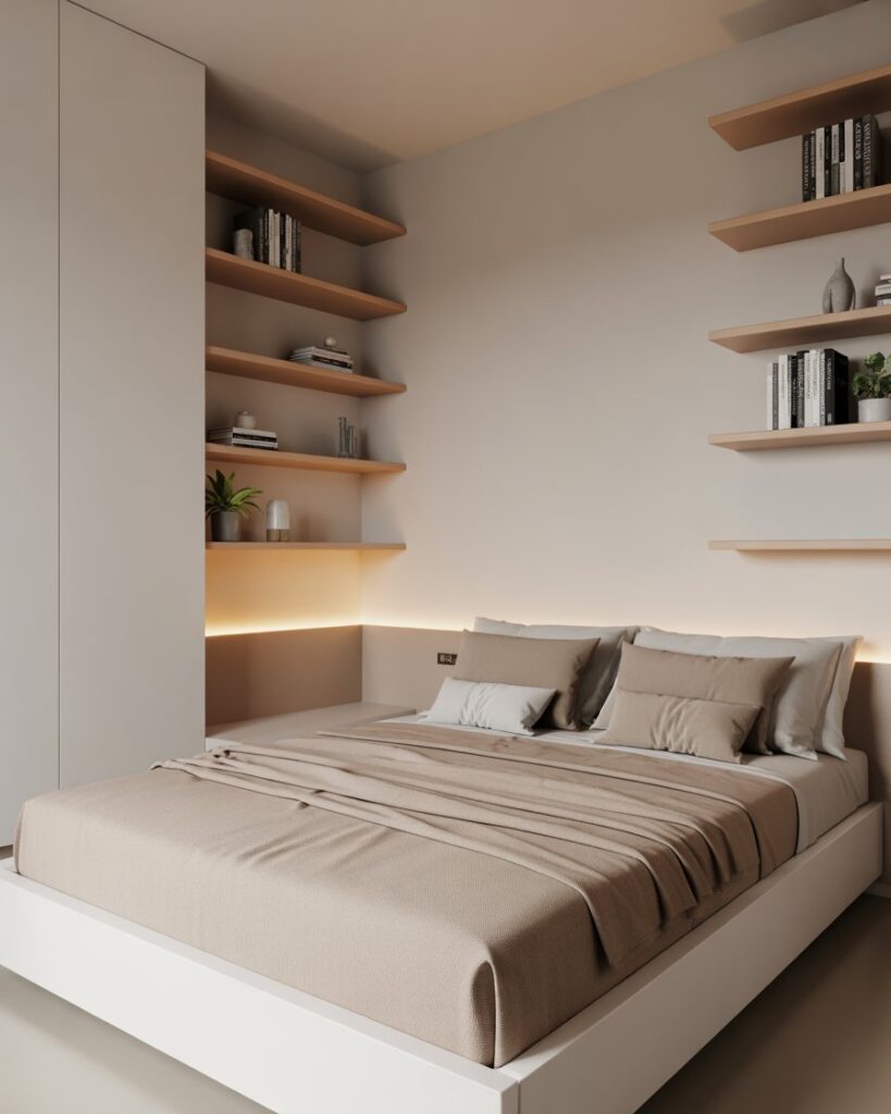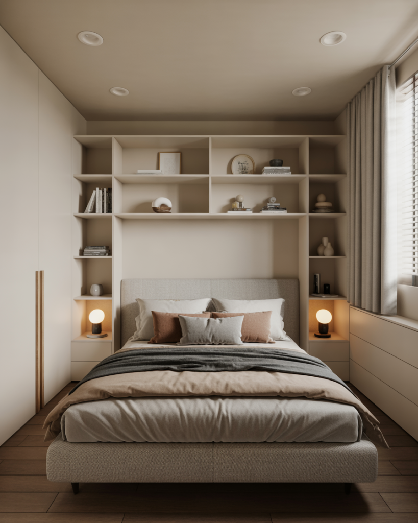 A small room, Tiny, smart Modern layout makes the most of vertical height—something I learned from a friend in NYC who transformed her narrow room by stacking storage all the way up. Wall-mounted lights and tall shelving free floor area, giving couples more breathing space. Designers say vertical thinking will be essential for urban couples in 2026.