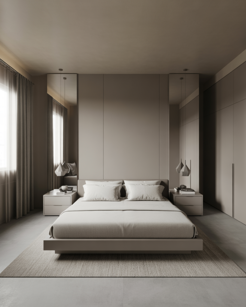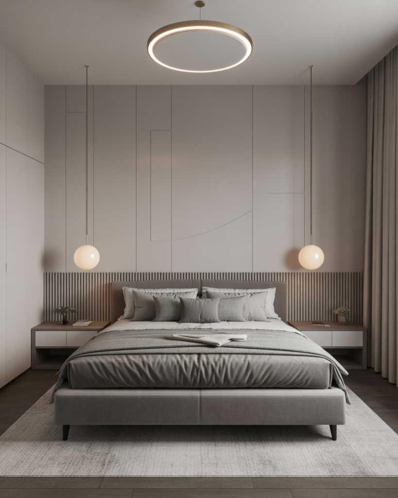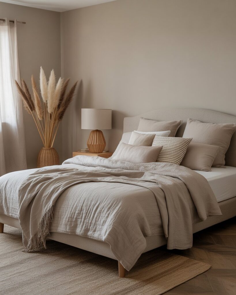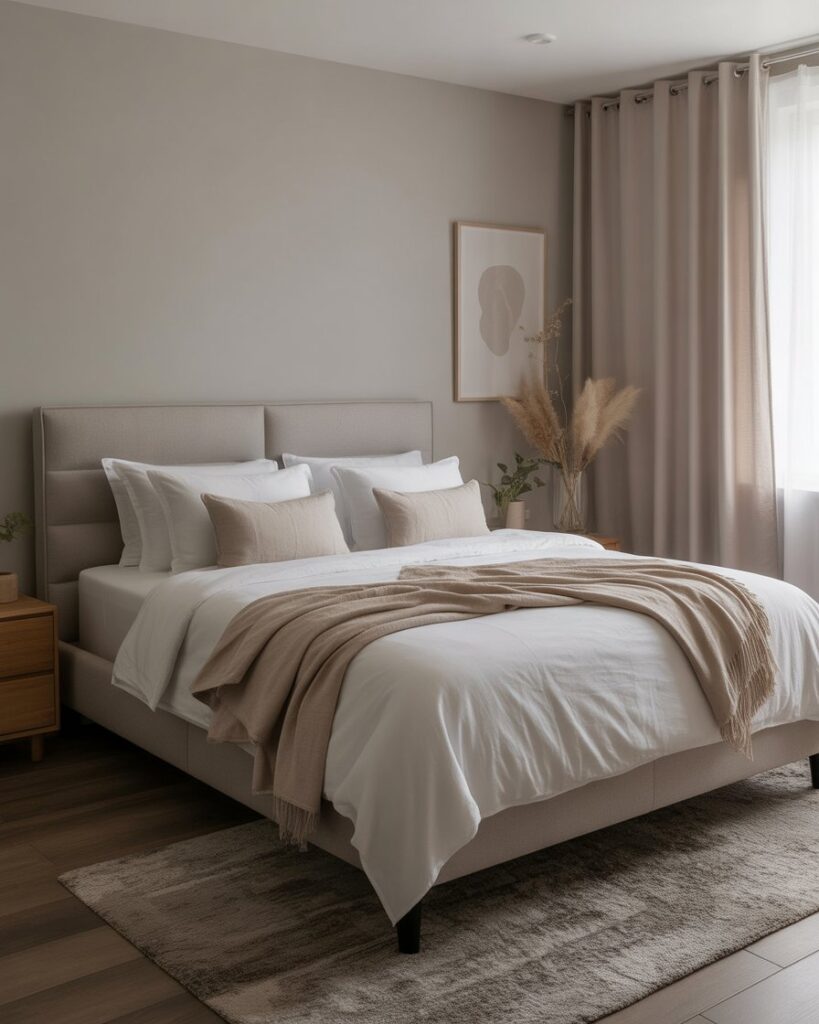 A soft Grey, Cozy, lightly minimalist setting creates a soothing “cloudlike” bedroom feel for couples who crave peace after long days. Pale greys, plush throws, and airy curtains create a gentle, weightless atmosphere. A friend once joked her grey room “felt like sleeping inside a quiet morning,” and that’s exactly the effect many designers aim for in 2026—rest without visual noise.