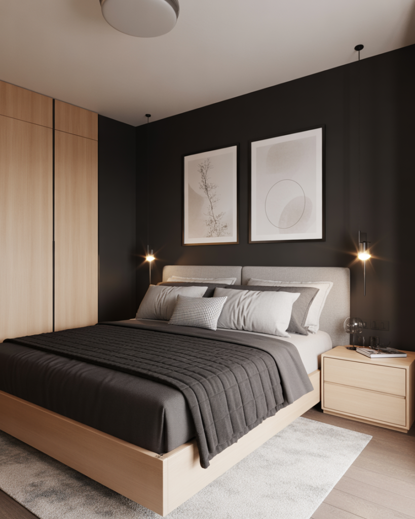 A black, Modern, Classy combo with light wood appeals to couples wanting contrast without harshness. Black metal frames, pale oak furniture, and simple shapes create harmony in both large and small space layouts. I once saw this mix in a designer’s loft and was surprised how balanced it felt—bold but not overwhelming, modern yet approachable. It’s a favorite among 2026 stylists.