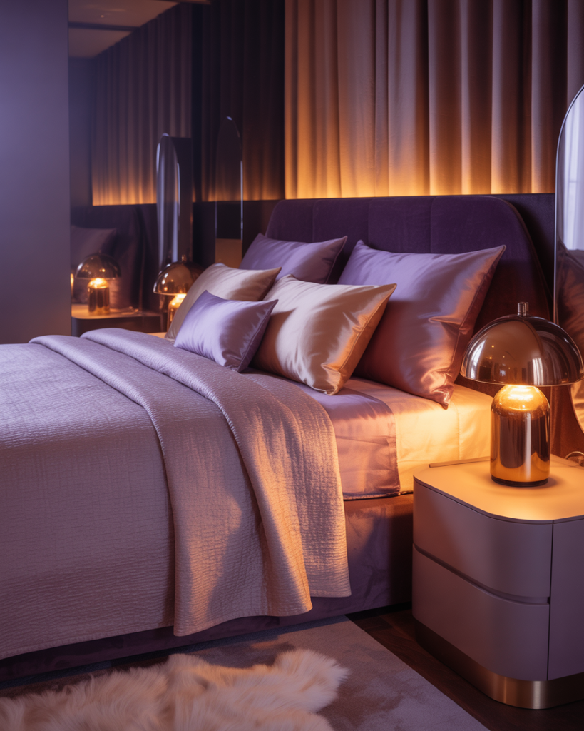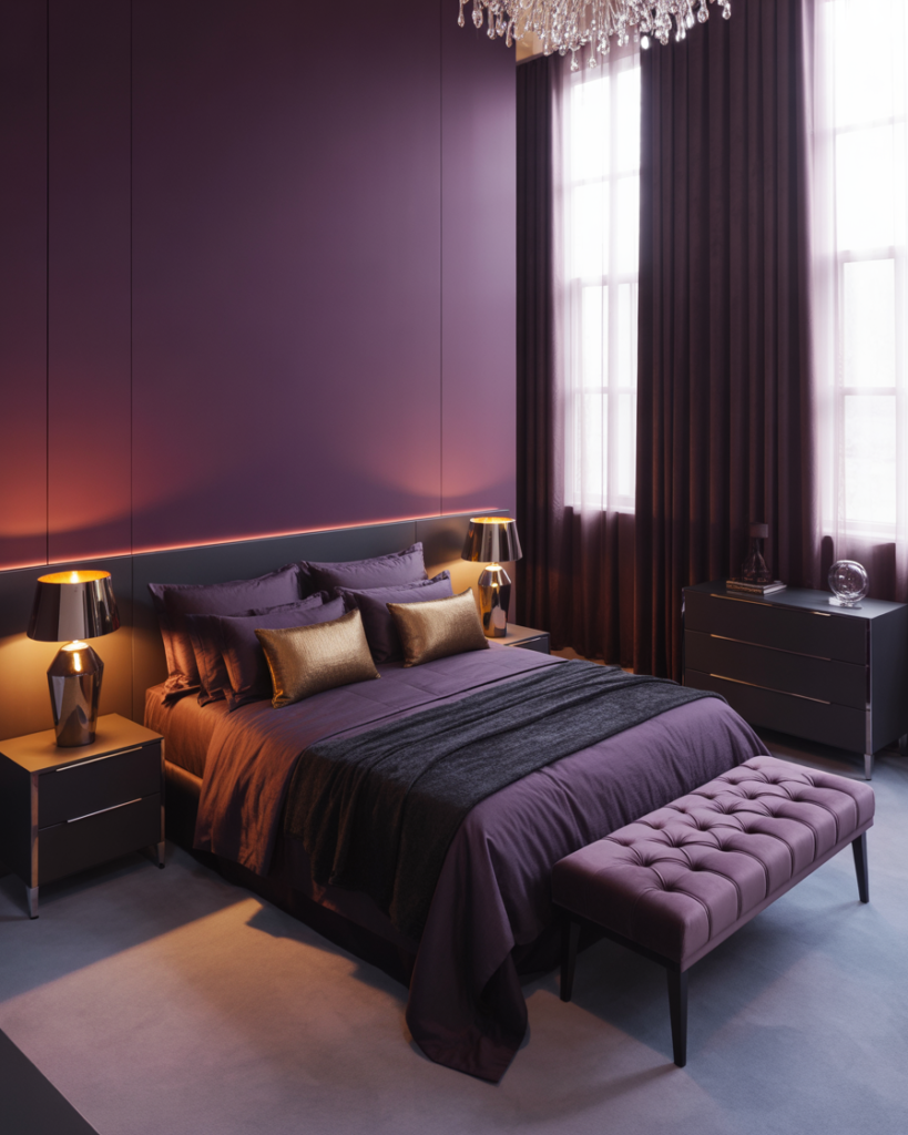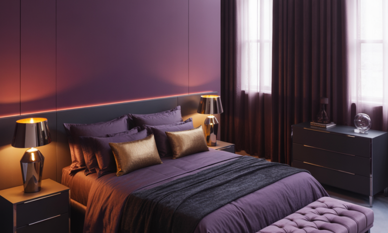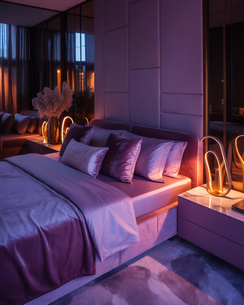 Deep or soft Purple, Moody, lightly Romantic lighting gives a bedroom an evening-inspired calm perfect for couples who unwind late at night. Purple tones paired with warm lamps create a dreamy, introspective feel. A couple I know added plum curtains last year and swear it improved their wind-down routine. Color psychologists expect purple to trend in bedrooms through 2026 for its emotional depth.