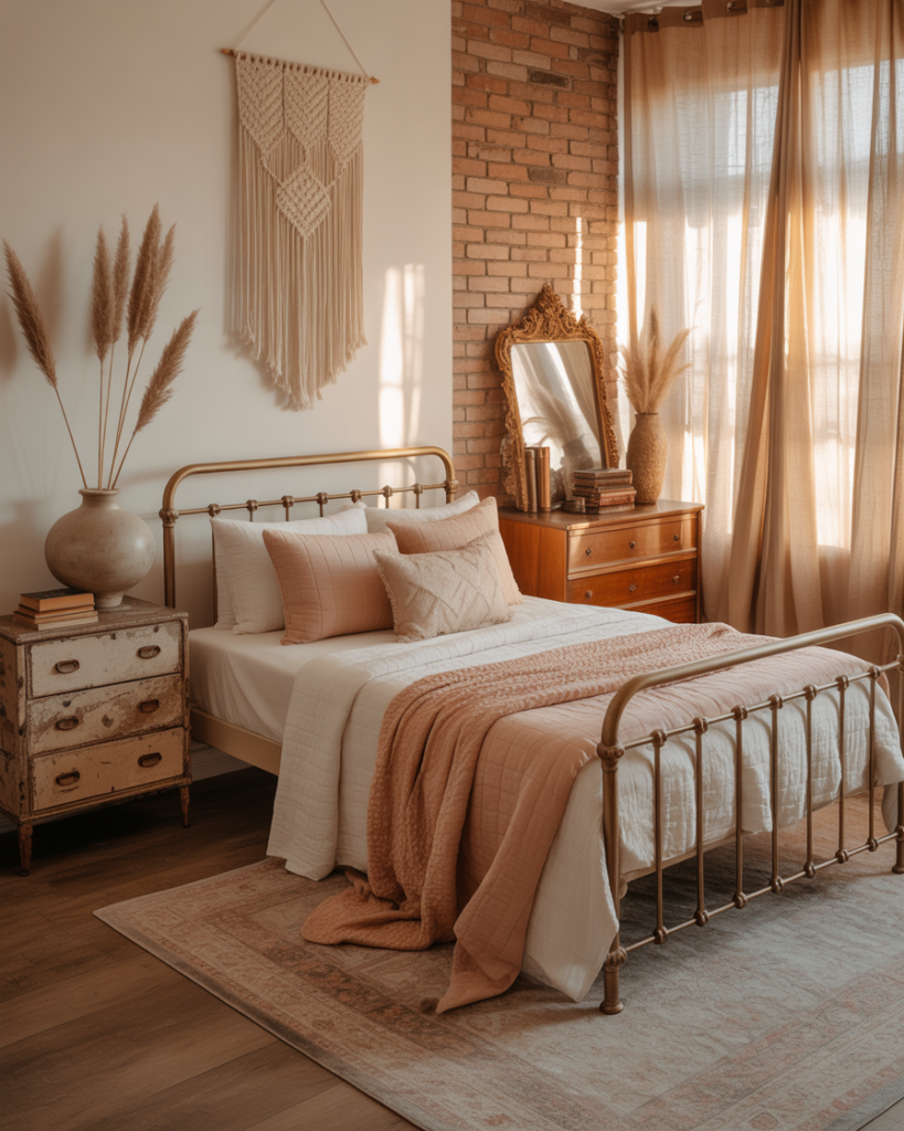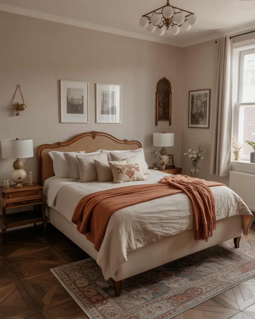 A vintage, Cute, gently aesthetic blend of old-meets-new decor gives couples a chance to showcase personality. Mixing thrifted mirrors, floral prints, and modern bedding creates a playful but coherent room. My neighbor collects antique frames, and pairing them with modern furniture made her bedroom feel uniquely hers. Designers predict eclectic vintage charm will remain huge in 2026.