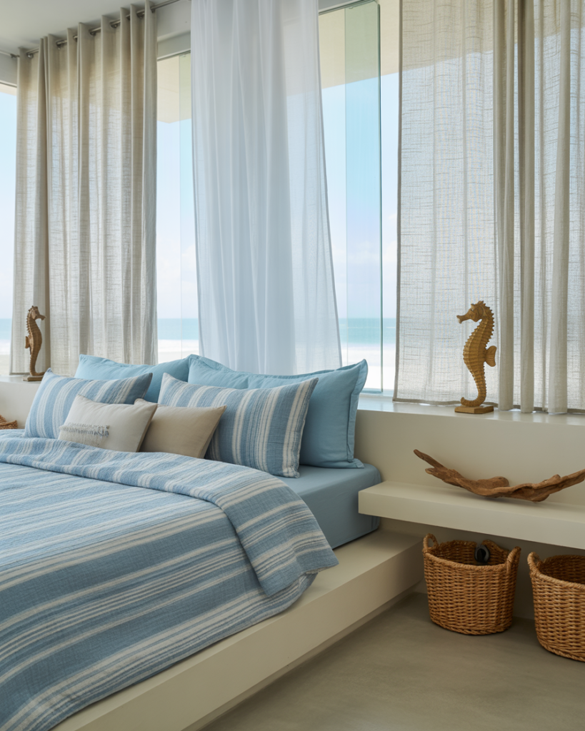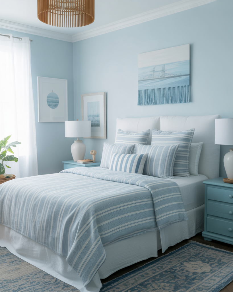 A Blue, Cute, lightly Fun coastal look creates breezy energy in a shared bedroom, even far from the shore. Soft stripes, oceanic hues, and simple white accents make mornings feel brighter. Friends of mine in Chicago recreated a coastal palette to offset gloomy winters, and it worked wonders. Designers expect airy coastal notes to trend again in 2026.