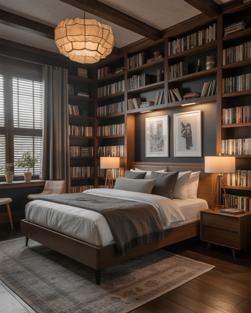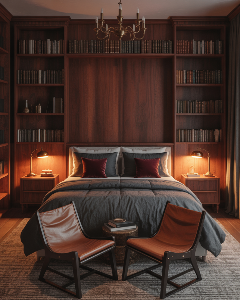 A Moody, Modern, slightly vintage library theme—dark woods, soft lamps, and book-lined shelves—creates a warm intellectual retreat for couples who love reading. I once slept in a library-style guest room and found the ambience incredibly calming. This style is expected to grow in 2026 as more couples seek personal “escape corners” within their bedrooms.