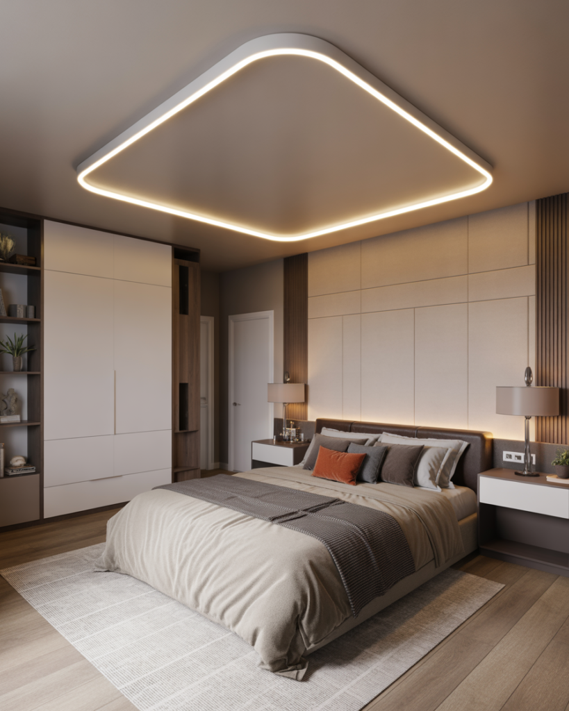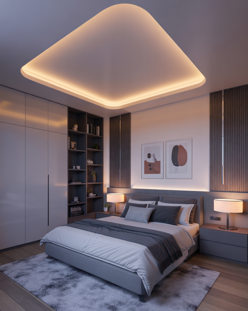 A clever led lights, Modern, aesthetic ceiling design transforms the whole mood of the bedroom. Couples can set warm, cool, or color-shifted lighting depending on the moment. I tested this in my own home last year, and the flexibility was surprising—it made nights feel more relaxing and mornings brighter. Lighting tech is predicted to be huge in 2026.
